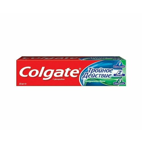 Трехцветная зубная паста Colgate «Тройное действие» защищает от кариеса, удаляет потемнения с поверхности зубов, тем самым делая зубы белее, и освежает дыхание. Обладает приятным мятным вкусом. Содержит кальций для глубокого очищения эмали. Одобрено Стоматологической Ассоциацией России.