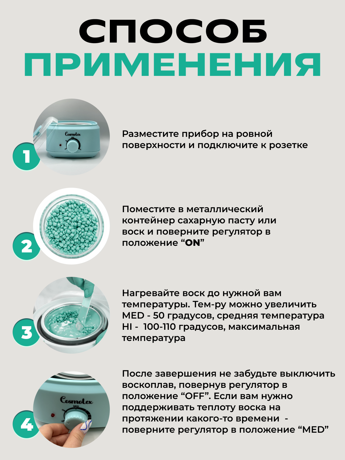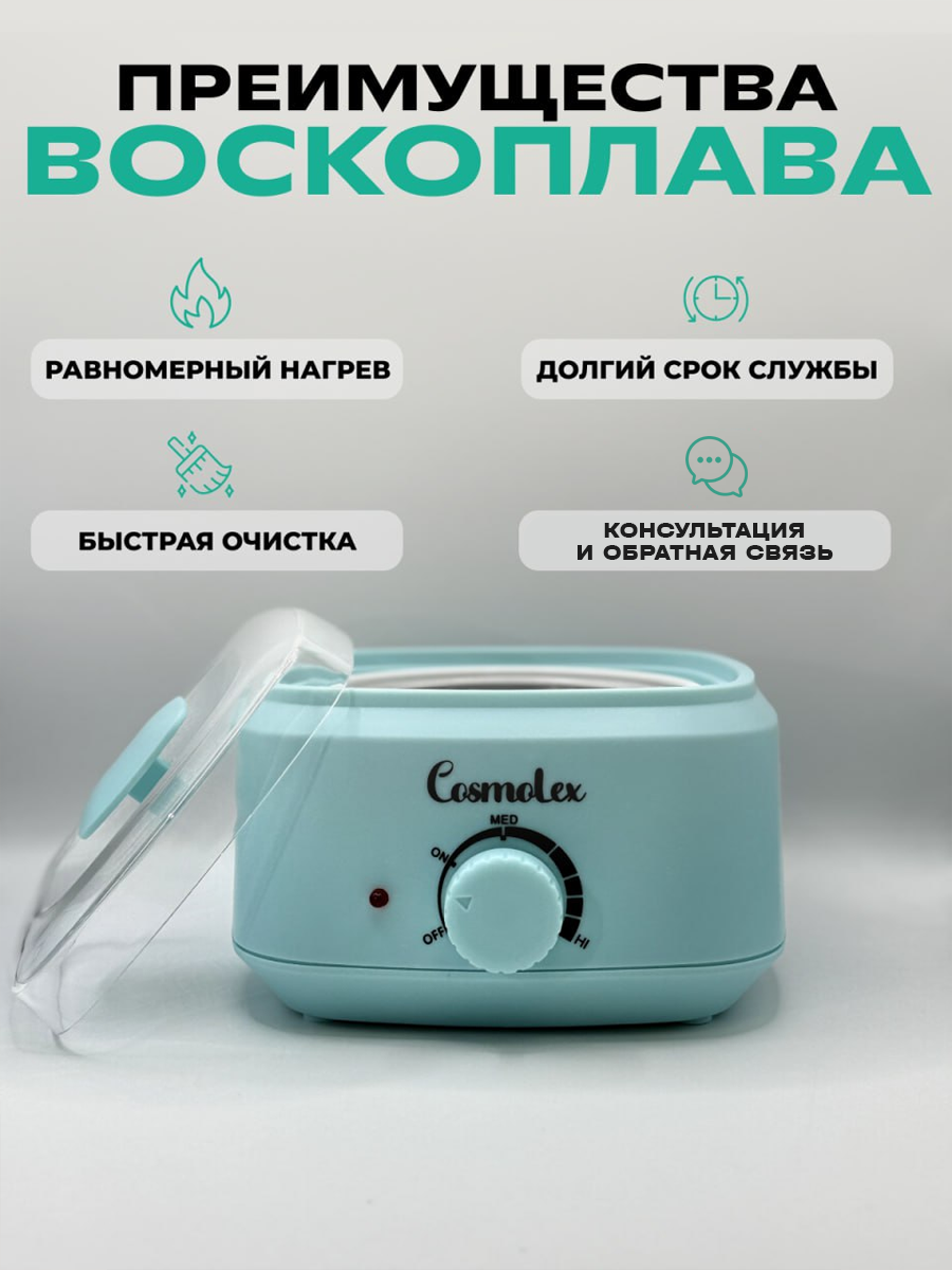 Воскоплав косметический от Cosmolex для салонов красоты, теперь у вас дома. Воскоплав баночный для разогрева воска со съёмной алюминиевой чашей объёмом 400 мл. Cовременное высококачественное электрическое оборудование, которое предназначено для плавления и поддержания необходимой температуры воска во время проведения процедуры удаления волос. Электрический, работает от сети 220 В, имеет регулятор с температурой плавления от 35 до 100 градусов. Уникальный дизайн , прозрачная вентилируемая крышка, которая позволяет следить за процессом плавления воска. Воскоплав профессиональный обеспечивает максимально быстрый прогрев воска в течение 15-20 минут. Помимо регулятора у воскоплава есть сигнальная лампочка. Благодаря функции воскоплава для депиляции «Обогрев чаши 360 градусов» воск не перегревается, температура нагрева однородна. Данную модель удобнее использовать, чем воскоплав картриджный, так как воскоплав баночный поддерживает температуру разогретого воска долгое время - не нужно лишний раз нагревать. Он компактен, не занимает много место, разогревать воск возможно небольшими порциями. Может использоваться в профессиональных целях и в домашних условиях. Достаточно поместить во вместительную ёмкость специальные гранулы, воск или пасту, а после достижения необходимой температуры, удалить даже самые сложные волоски – короткие, тонкие, светлые и вросшие. Этот косметический аппарат отличный аксессуар для мастера бровиста и косметолога. Очень компактный, занимает мало места на столе. Воскоплав подойдёт для бровей, для лица, для подмышек, для зоны бикини, для ног. Он быстро плавит воск в гранулах, парафин и пасту для шугаринга, поддерживает заданную температуру и легко очищается от остатков материала. Профессиональные салонные процедуры далеко не всем по карману, есть более недорогие, но действенные способы. Депиляция воском в домашних условиях – одно из таких эффективных решений. Идеальный подарок на любой праздник , день рождения, 14 февраля и 8 марта маме, сестре, подруге.