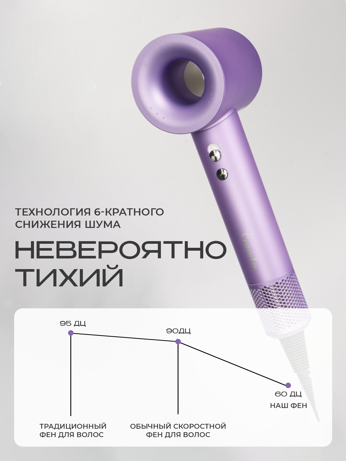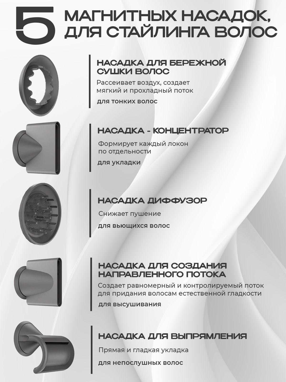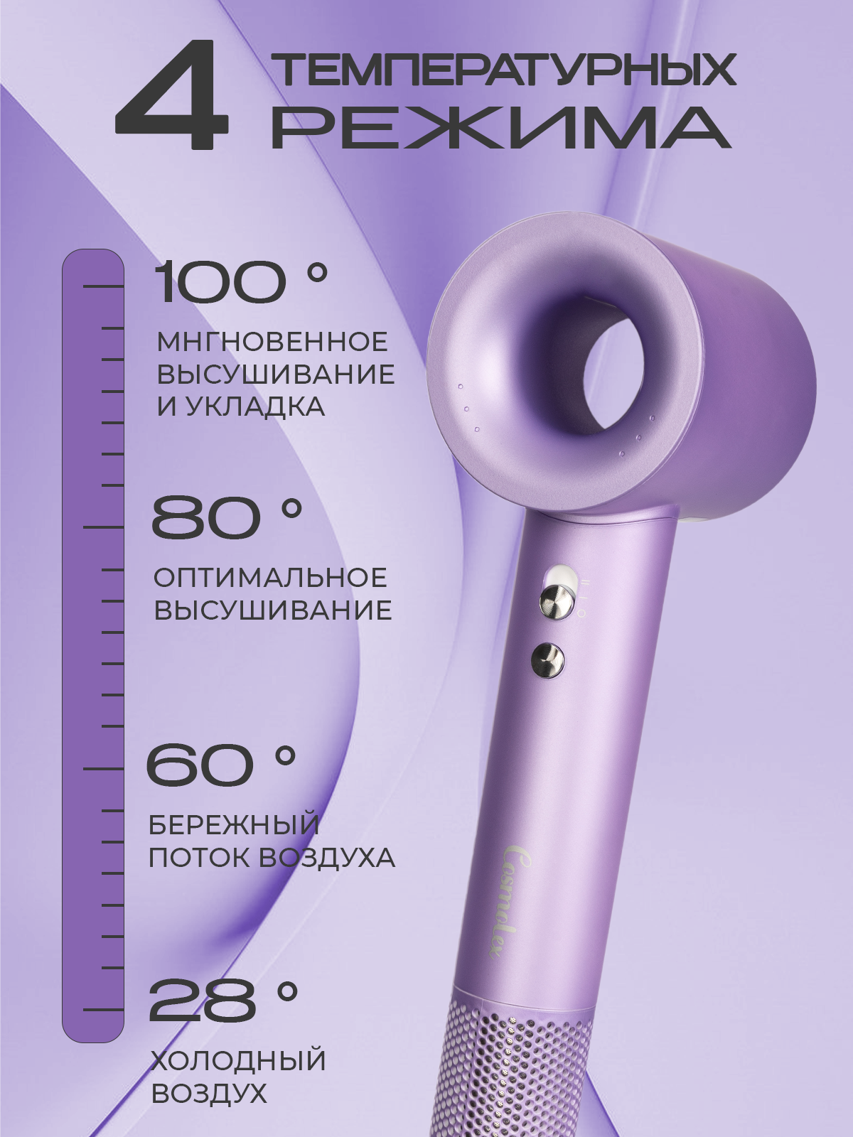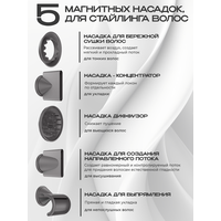 Фен Cosmolex - профессиональный фен для волос 5 в 1 - это качественная бытовая техника для мужчин и женщин. Благодаря четырем режимам работы (холодный, нормальный, теплый, горячий), быстрая сушка и укладка волос не составит труда. Набор имеет также защиту от перегрева, обдув холодным воздухом и обладает функцией ионизации. Фен обеспечивает быструю сушку, бесшумный, безопасный и здоровый уход за волосами любого типа: короткими или длинными, кудрявыми или прямыми, а также пушистыми и непослушными. Параметры нагрева и скорость обдува регулируются с помощью электронной панели управления. Универсальный фен с пятью насадками – это устройство, позволяющее совершать здоровую сушку волос и создавать их прикорневой объем. Также доступно создание волнистых крупных локонов, кудрей и множества других стильных и красивых причесок. Два режима мощности и четыре температурных режима, а также функция холодного обдува и турборежим позволят максимально оптимизировать процесс. В комплекте с феном идут 5 магнитных насадок: для бережного высушивания, для непослушных волос (выпрямление), диффузор, концентратор и насадка для создания направленного потока воздуха. Благодаря насадкам можно придать объём причёске, создать небрежные локоны, выпрямить пряди, сделать завивку. Дополнительную защиту волос обеспечивает наличие ионизатора, благодаря которому воздушный поток не оказывает негативного воздействия на волосы. Многофункциональный мультистайлер делает возможным создание самых разных причесок. Мощный профессиональный фен можно использовать и дома, и в салонах красоты, и в обычных парикмахерский. Многофункциональный фен со множеством опций - это отличный подарок для любимой девушки, жены, мамы, дочери, бабушки на день рождения, юбилей, свадьбу.
