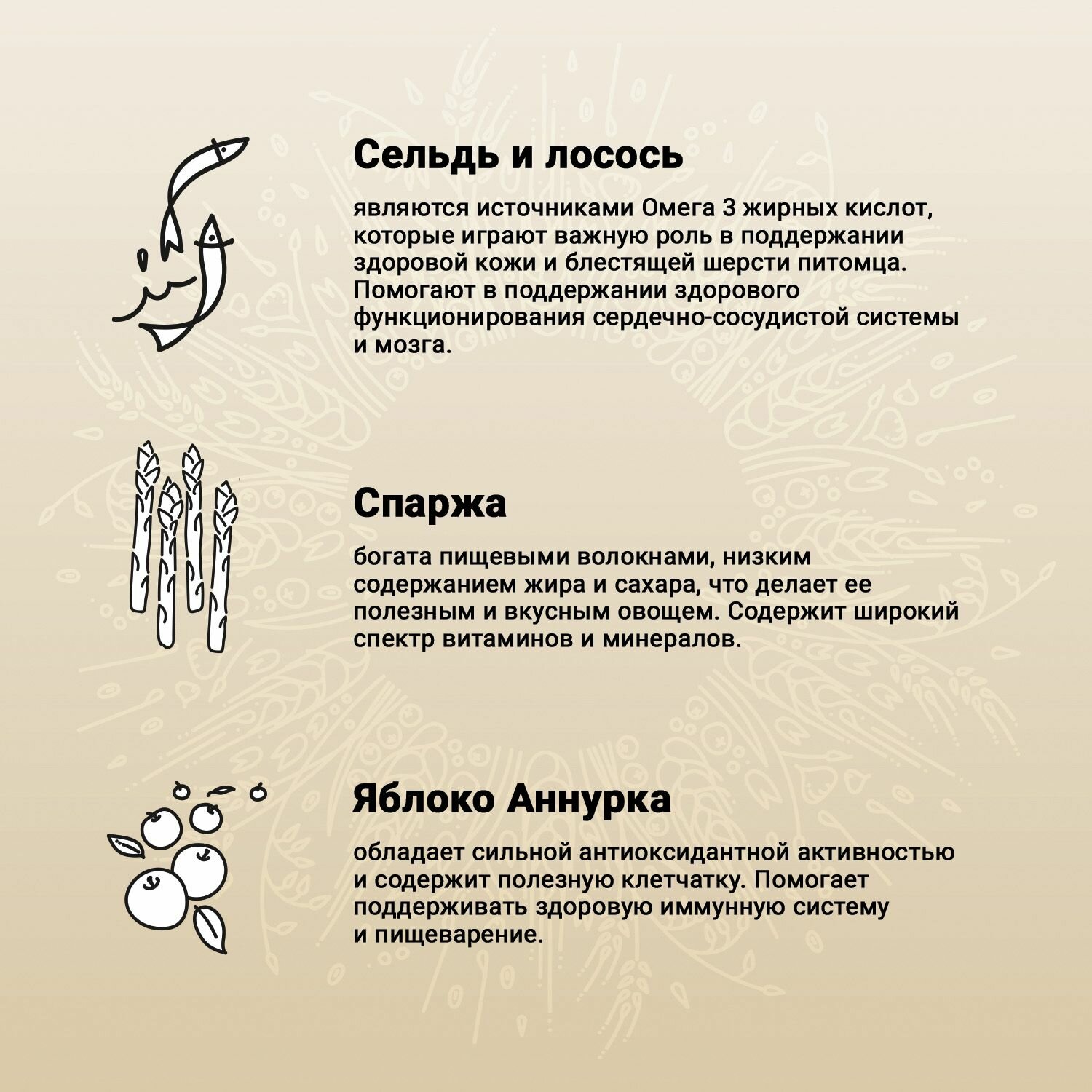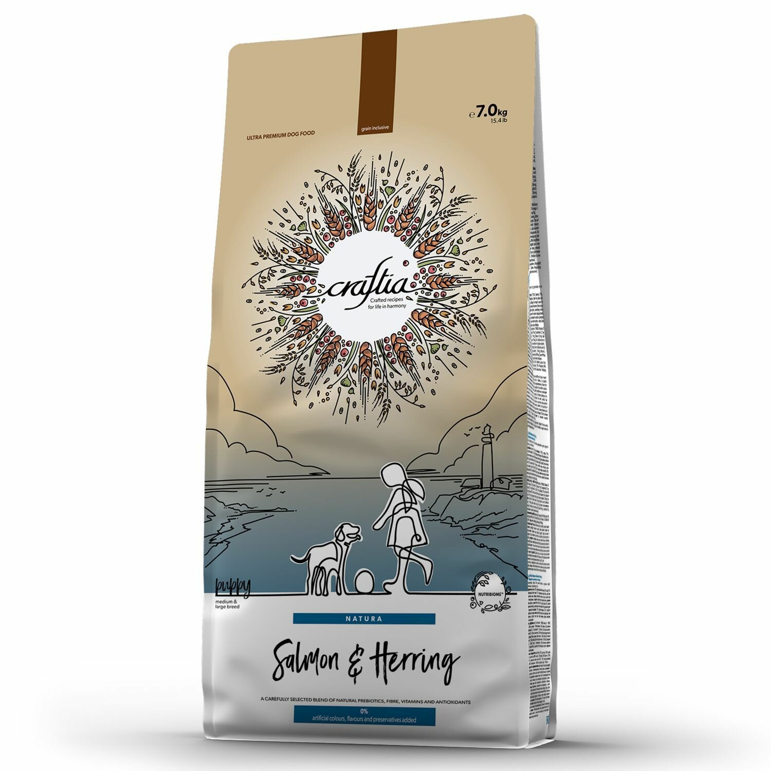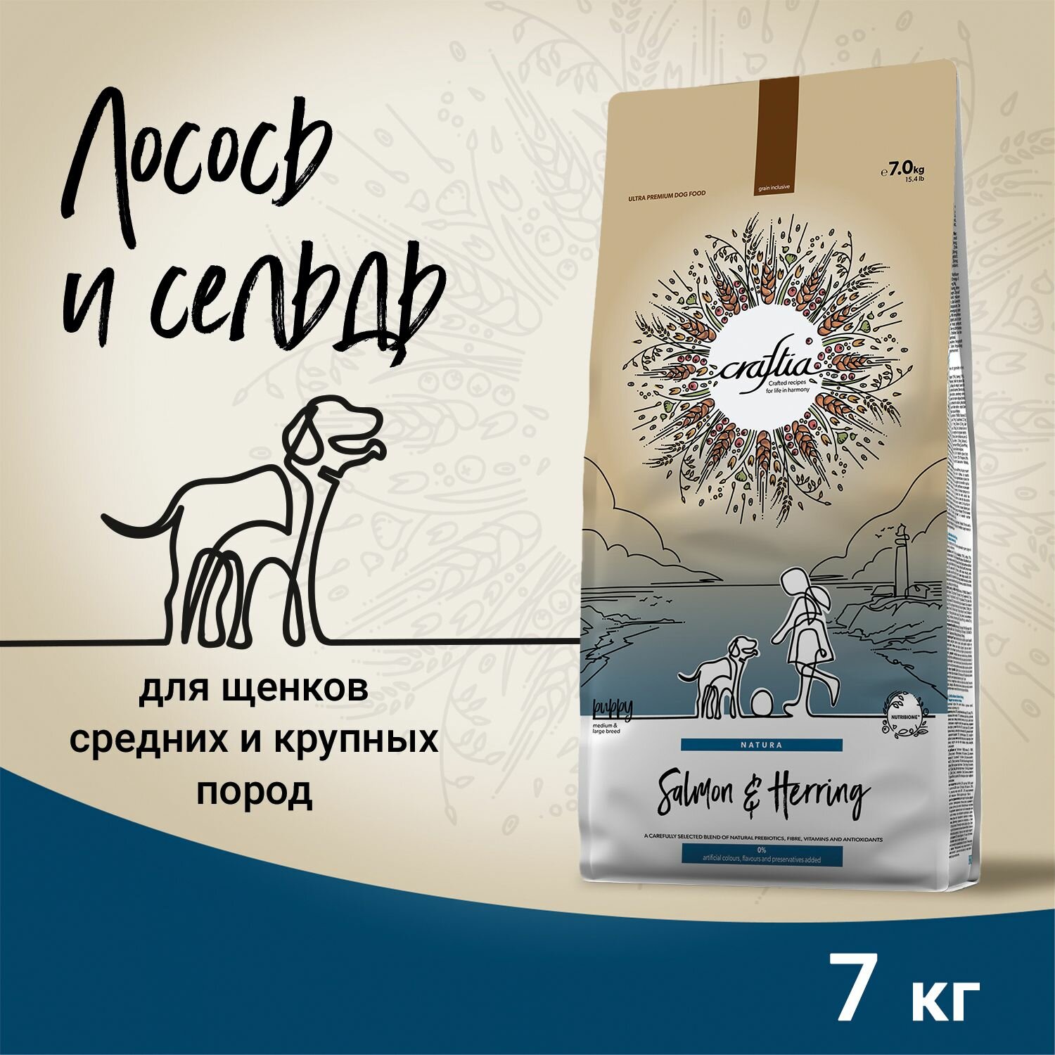 CRAFTIA NATURA сухой корм для щенков средних и крупных пород из лосося и сельди CRAFTIA NATURA - корм для собак ультрапремиум класса, созданный с любовью к природе. Состав кормов CRAFTIA прозрачен и понятен, отсутствуют скрытые добавки и сомнительные ингредиенты. Все, что заявлено в составе корма, гарантированно присутствует в каждой грануле. Собственный завод, сотни квадратных метров научно-исследовательских лабораторий, первоклассное сырье — все это позволяет создавать тщательно сбалансированный высокобелковый корм корм с холистическим подходом. Все компоненты корма подходят для употребления человеком и не содержат ГМО. Продукт соответствует высоким стандартам качества и имеет следующие сертификаты соответствия: HACCP, ISO 9001, ISO 14001, ISO 18001, ISO 45001, DQS, IFS. Ингредиент №1 — свежее мясо. Это лучший источник белка из возможных. Кроме того, он делает вкус корма очень привлекательным для питомцев. Запатентованная формула NUTRIBIOME — тщательно подобранная смесь пребиотиков, клетчатки, мультивитаминов, антиоксидантов. Функциональные добавки — Омега-6 и Омега-3, глюкозамин, хондроитин. Жирные кислоты помогают поддерживать здоровье кожи и шерсти, играют важную роль в поддержании здоровья сердечно-сосудистой системы, обладают противовоспалительными свойствами. Глюкозамин и хондроитин способствуют здоровью суставов, восстанавливают хрящевую Бурые водоросли ASCOPHYLLUM NODOSUM уменьшают зубной налет, неприятный запах, кровоточивость десен, сокращают образование зубного камня. Получается, что во время еды питомец одновременно чистит зубы: Ascophyllum nodosum размягчает зубной налет, а при жевании сухих гранул этот налет механически удаляется. 0% искусственных красителей, ароматизаторов, консервантов. 0% ГМО. 0% химической обработки сырья. Основные источники белка в корме — лосось и сельдь. Они богаты незаменимыми Омега-3 жирными кислотами и минеральными веществами. Жирные кислоты контролируют воспалительные процессы в организме, что хорошо влияет на здоровье суставов. Легкоусвояемый рыбный белок способствует формированию крепкой мускулатуры, улучшает состояние кожи. Источники углеводов — спельта, бурый рис, ячмень, овес и просо. Специально подобраны злаки с разным гликемическим индексом, чтобы питомец дольше чувствовал себя сытым: глюкоза поступает в организм постепенно, а значит, чувство голода не наступает дольше. Источники клетчатки — свекольная пульпа, волокна гороха и люцерновая мука. Свекольная пульпа способствует здоровью слизистой кишечника, гороховая клетчатка стимулирует перистальтику, а люцерновая мука способствует размножению полезной микрофлоры кишечника. Суперфуды в корме — спаржа, черника, клюква, ацерола и многие другие. Суперфуды являются источниками витаминов, биологически активных компонентов и обладают антиоксидантными свойствами. Попробуйте Craftia, ощутите уверенность в качестве корма своего питомца — и наслаждайтесь жизнью в гармонии с природой!
