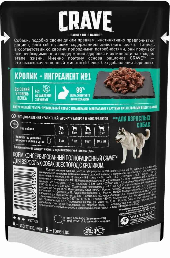 Влажный корм CRAVE для взрослых собак, содержащий минимум 99% ингредиентов животного происхождения, вдохновлен естественным рационом собаки. Ингредиент № 1 в нем — настоящее мясо. Это придает питомцу энергию, насыщает белком и поддерживает организм в тонусе. Следует кормить собаку согласно рекомендованным кормам. Рядом с местом кормления должна быть миска со свежей питьевой водой. При массе собаки 3 кг рекомендуемое количество упаковок влажного корма в сутки – 3 шт. При массе собаки 5 кг рекомендуемое количество упаковок влажного корма в сутки – 5 шт. При массе собаки 10 кг рекомендуемое количество упаковок влажного корма в сутки – 8 шт. При массе собаки 15 кг рекомендуемое количество упаковок влажного корма в сутки – 10,5 шт.