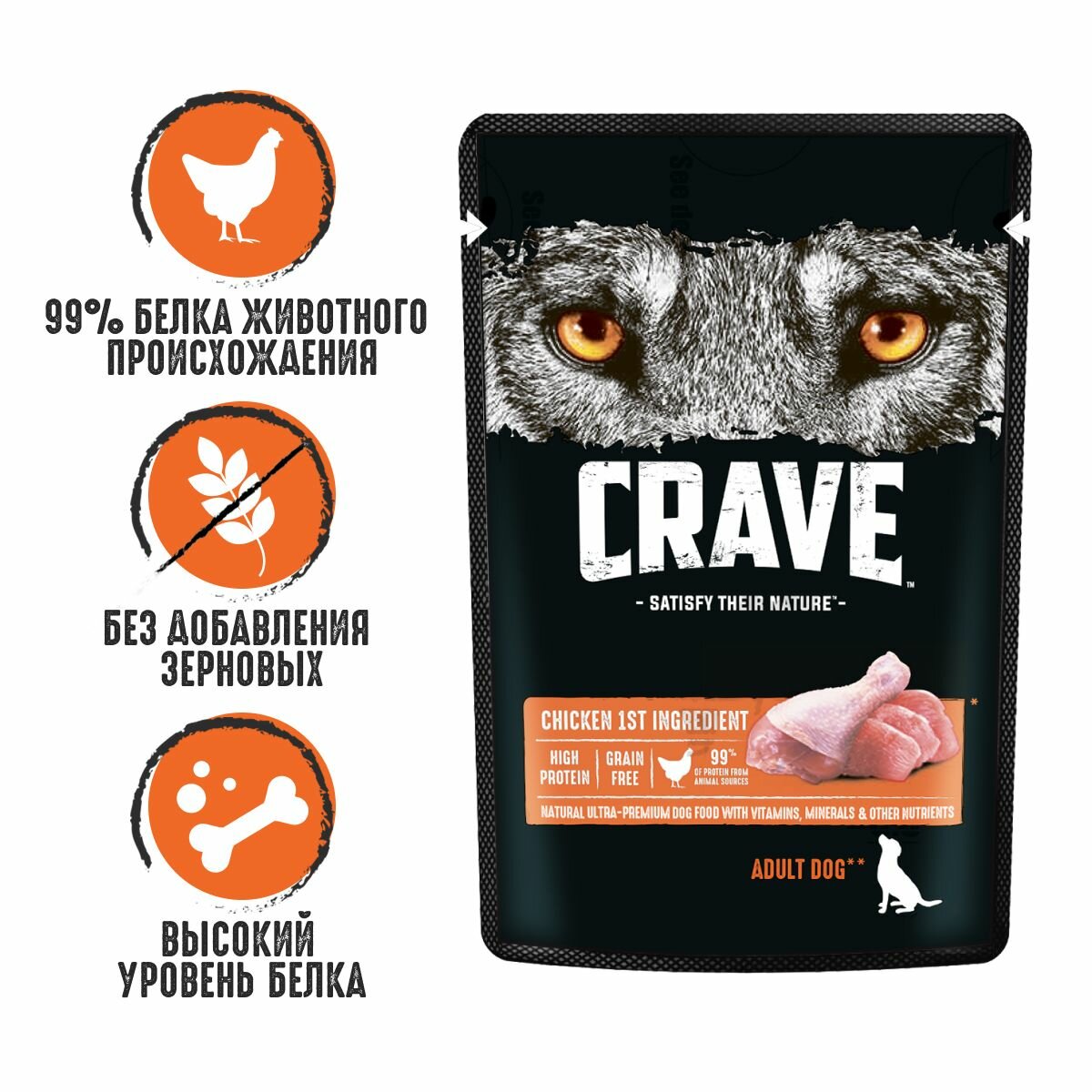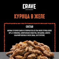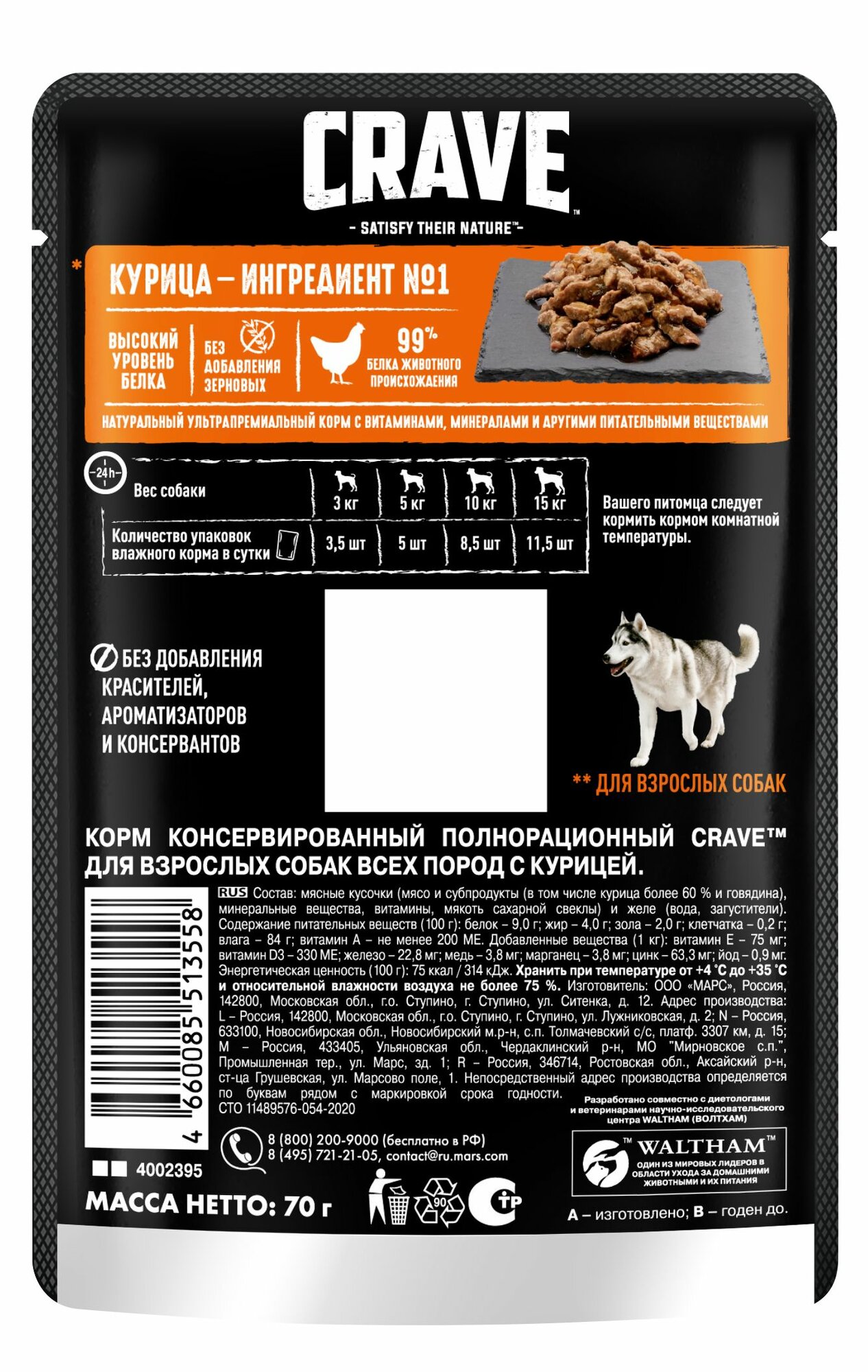 - Влажный корм CRAVE™ для взрослых собак, содержащий минимум 99% ингредиентов животного происхождения, вдохновлен естественным рационом собаки. Ингредиент № 1 в нем — настоящее мясо. Это придает питомцу энергию, насыщает белком и поддерживает организм в тонусе. Состав: мясные кусочки (мясо и субпродукты (в том числе говядина более 40%, курица и индейка), минеральные вещества, витамины, мякоть сахарной свеклы) и соус (вода, загустители). Содержание питательных веществ (100 г): белок – 9,0 г, жир – 3,7 г, зола – 2,0 г, клетчатка – 0,2 г, влага – 81 г, витамин А – не менее 200 МЕ. Добавленные вещества (1 кг): витамин Е – 75 мг, витамин D3 – 330 МЕ, железо – 22,8 мг, медь – 3,8 мг, марганец – 3,8 мг, цинк – 63,3 мг, йод – 0,9 мг. Рекомендации ПО кормлению: Следует кормить собаку согласно рекомендованным кормам. Рядом с местом кормления должна быть миска со свежей питьевой водой. При массе собаки 3 кг рекомендуемое количество упаковок влажного корма в сутки – 3,5 шт. При массе собаки 5 кг рекомендуемое количество упаковок влажного корма в сутки – 5 шт. При массе собаки 10 кг рекомендуемое количество упаковок влажного корма в сутки – 8,5 шт. При массе собаки 15 кг рекомендуемое количество упаковок влажного корма в сутки – 11,5 шт.