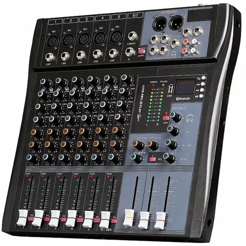 CRCBOX MR-60S - это семиканальный аналоговый микшерный пульт с Bluetooth-приемником и USB-проигрывателем MP3-файлов. Микшер применим для использования на выступлениях и мероприятиях, в клубах, в бюджетных и образовательных учреждениях. Устройство имеет прочный корпус из цельного металла.