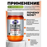 Креатин — это соединение, которое естественным образом встречается в организме, в первую очередь в скелетных мышцах. Функция креатина заключается в том, чтобы служить предшественником аденозинтрифосфата (АТФ), формы химической энергии, используемой всеми клетками. Запасы креатина в организме создают запас легкодоступного АТФ для получения энергии, которая необходима для быстрого прилива энергии и силу. Исследования показали, что добавки креатина могут помочь сохранить существующую мышечную ткань, поддержать рост и развитие мышечной массы, а также способствовать оптимальной производительности во время коротких периодов интенсивных упражнений. Микронизированный моногидрат креатина NOW® легко смешивается и не содержит добавок или консерванты.