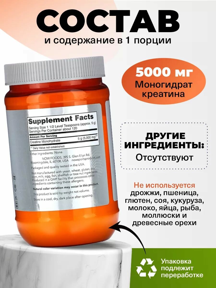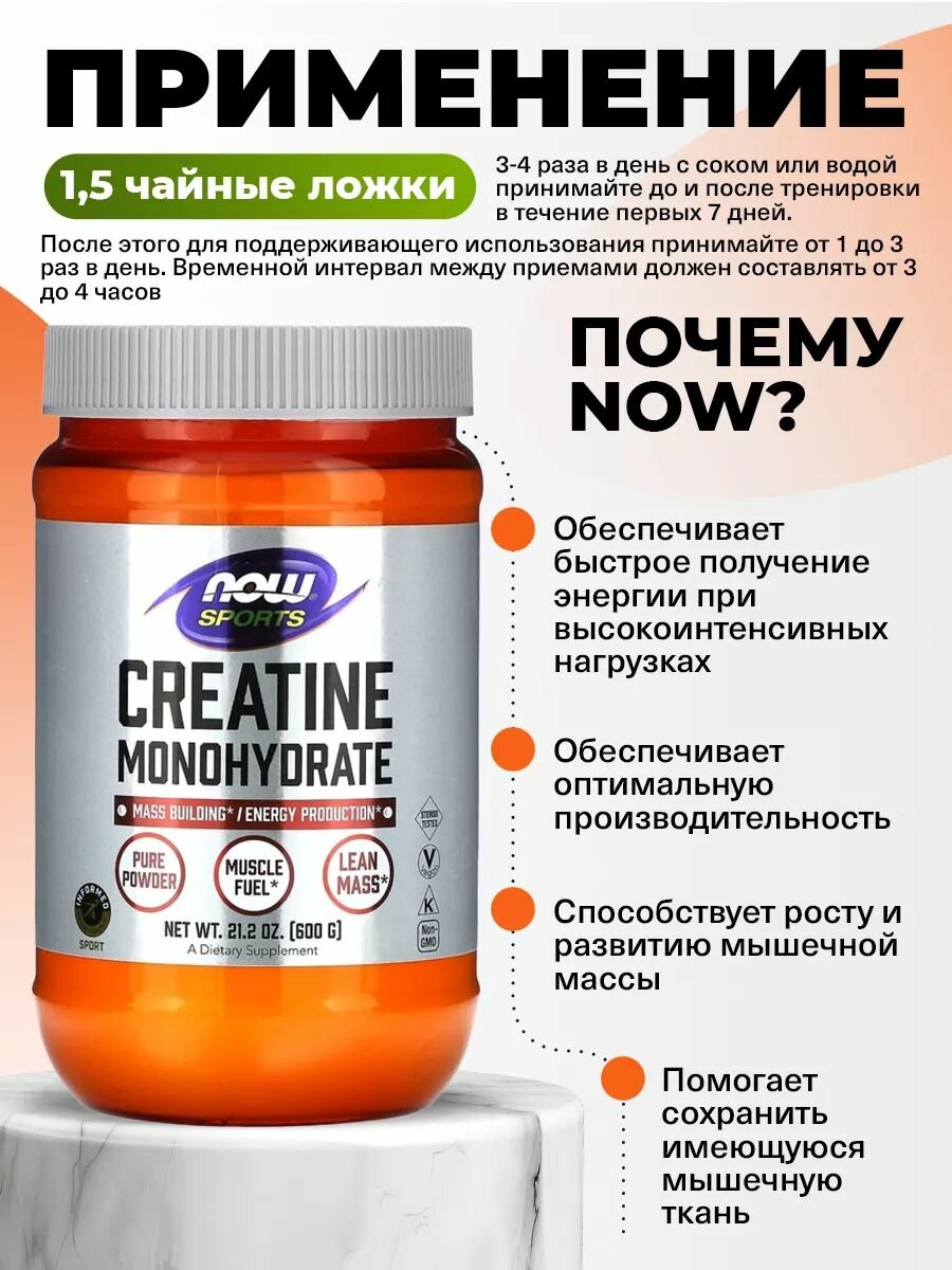 Креатин - это соединение, которое естественным образом встречается в организме, прежде всего в скелетных мышцах. Функция креатина заключается в том, чтобы служить предшественником аденозинтрифосфата (АТФ), формы химической энергии, используемой всеми клетками. Запасы креатина в организме создают пул легкодоступных АТФ для энергии, которая необходима для быстрой подачи энергии и силы. Исследования показали, что добавка креатина может помочь поддерживать существующие мышечные ткани, поддерживать рост и развитие мышечной массы и способствовать оптимальной производительности во время коротких циклов интенсивных упражнений. NOW® Creatine Monohydrate не содержит добавок и консервантов.