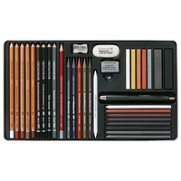 В набор входят карандаши и стержни для эскизов , водорастворимые графитовые карандаши, графитовые карандаши "Monolith" и водорастворимый графитовый карандаш "Monolith" , акварельные карандаши "Aqua Monolith", коричневые и серые мелки, уголь, графитовые палочки и ластик- клячка , ластик "Monolith", растушёвка, точилка и держатель для стержней.