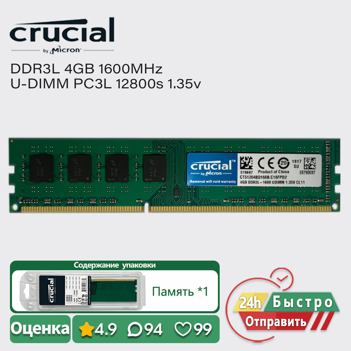 Crucial DDR3L 4GB 1600MHz ПК Оперативная память Настольные компьютеры UDIMM PC3L 12800u 1.35v RAM: сравнение цен, характеристики, фото, актуальное наличие и цены.