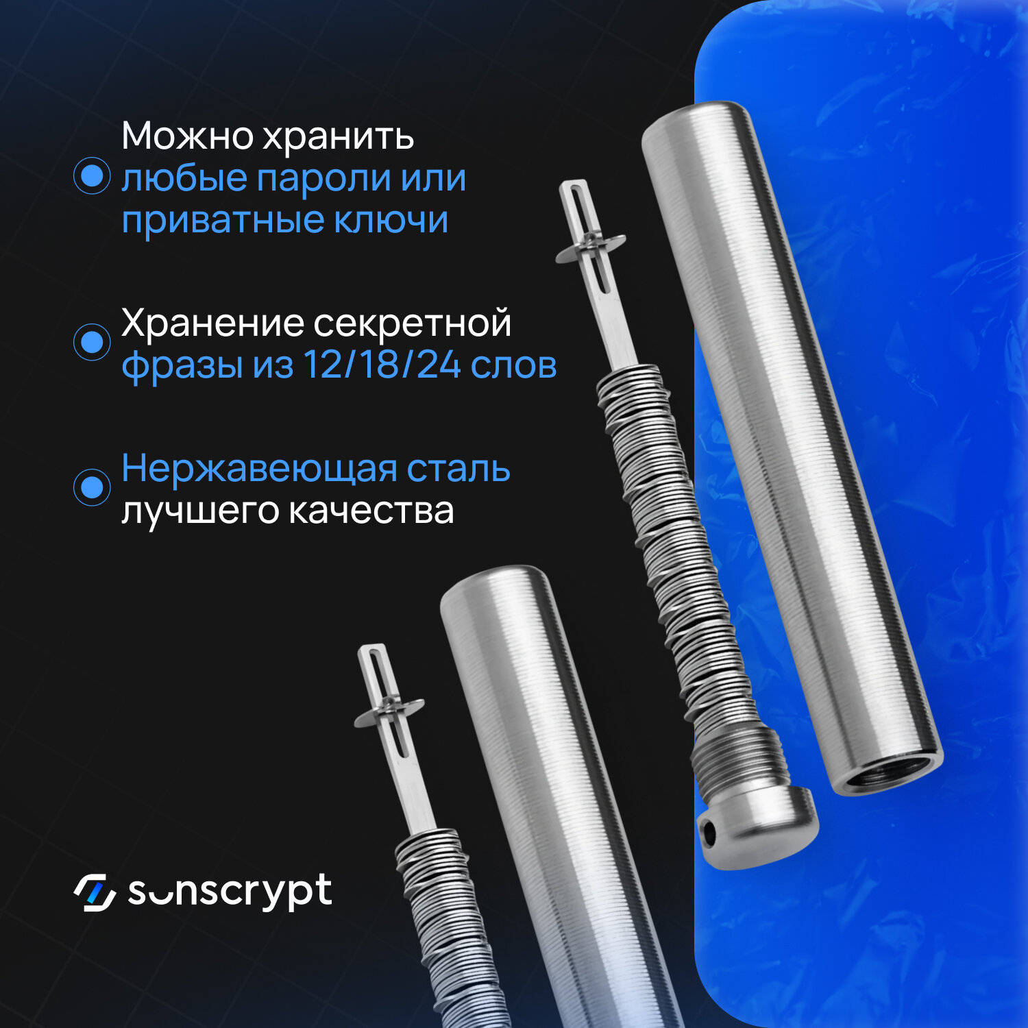 Cryptosteel Capsule DUO (Капсула) – это самое надежное физическое устройство для хранения вашей мнемонической фразы и паролей. В комплекте два устройства, что открывает больше возможностей защиты ваших приватных ключей. Например, вы можете разделить вашу кодовую фразу и хранить их в разных местах: фразу в одном месте, а пароли с кодовой фразой в другом и т.д.