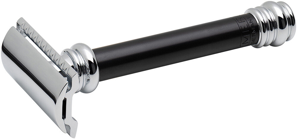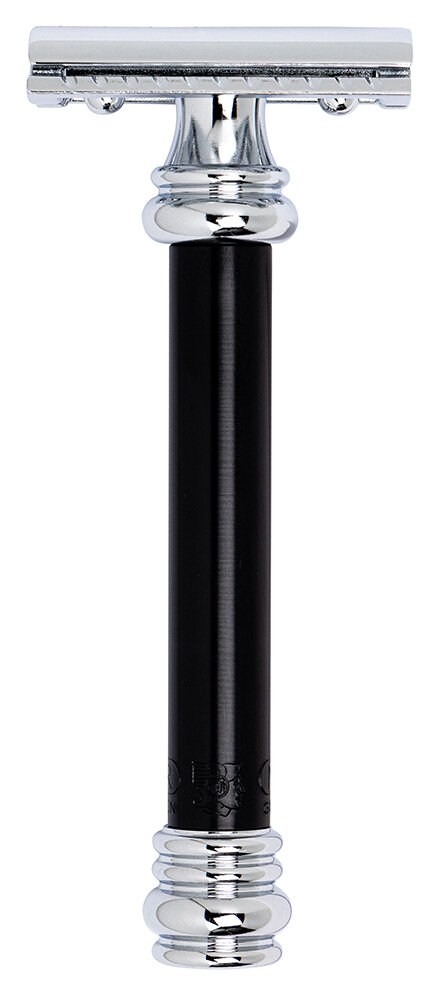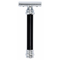 • Двусоставная • Прямой срез • Закрытый гребень • Длинная ручка 95 мм • Диаметр основания ручки: 11,5 мм • Размеры: плита - 41х25 мм, крышка - 40х19 мм • Глянцевое хромированное покрытие/анодированный алюминий в черном цвете • Лезвие в комплекте (1 шт.) • Дизайн и производство в Германии