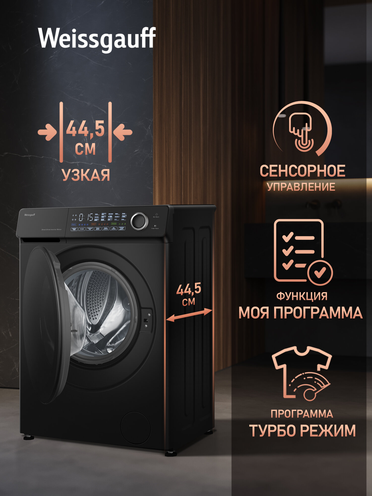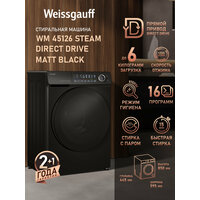 Отдельностоящая стиральная машина Weissgauff, выполненная в великолепном дизайне BLACK EDITION, оснащенная прямым приводом, инверторным двигателем и функцией пара, имеющая показатели загрузки до 6 кг белья и скорости отжима до 1200 оборотов в минуту - это настоящее качество по разумной цене!