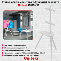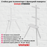 Стойка имеет съемную, умную монтажную пластину, разделенную на две отдельные части и подходит для крепления панелей с множеством размеров VESA – от 200x200 до 400x400 мм. UNITEKI ST005NW, ST005NS поставляется в оригинальной упаковке, с подробной инструкцией и набором креплений для напольной инсталляции.