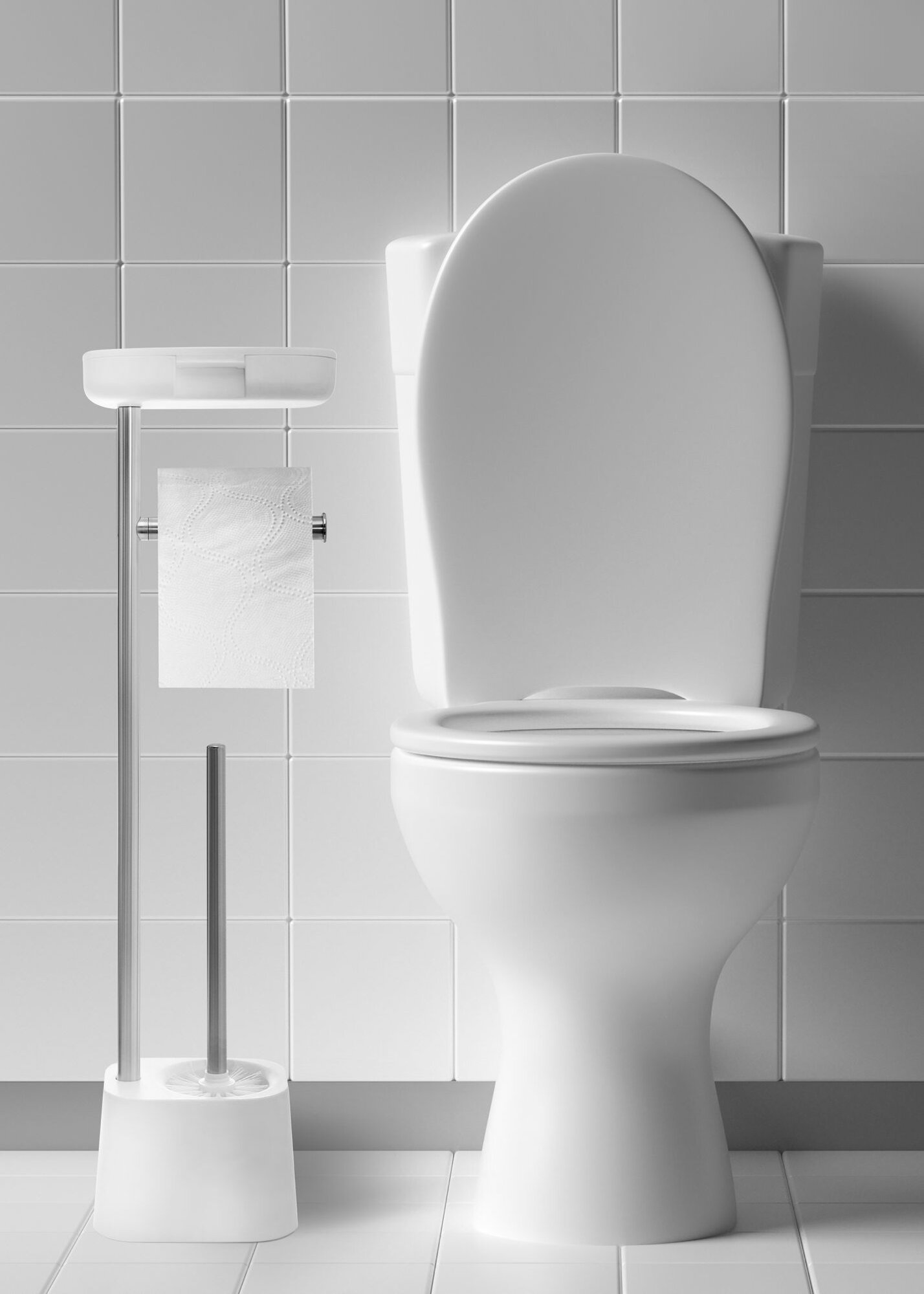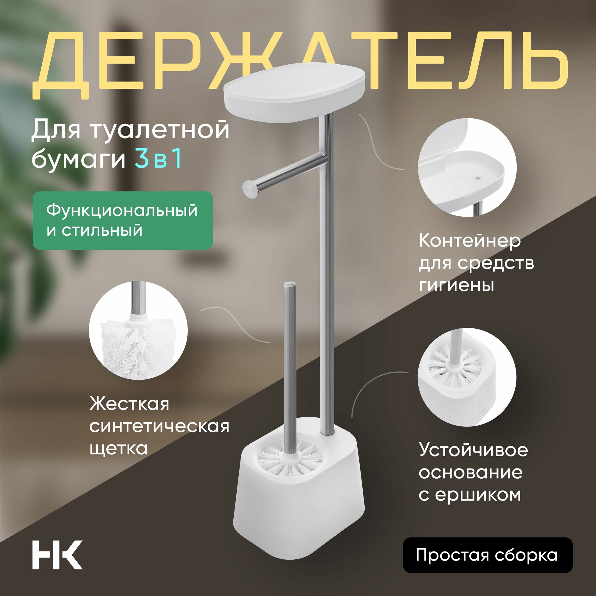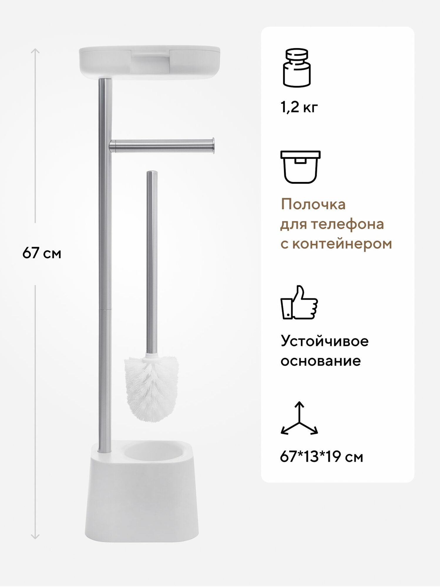 - Аксессуар для ванной 3 в 1: держатель для бумаги, ершик и полочка для телефона