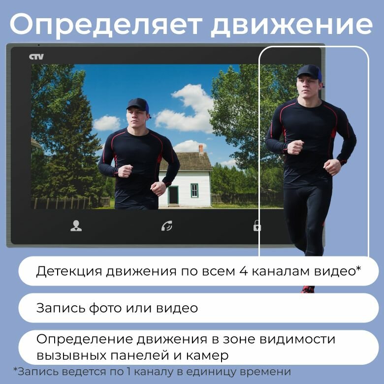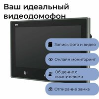 Цветной монитор видеодомофона 7" с поддержкой разрешения Full HD, с сенсорным управлением, детектором движения, функцией видеопамяти и встроенным источником питания.