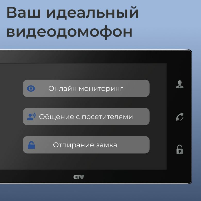 Монитор видеодомофона с экраном с технологией Touch Screen для управления OSD, стеклянная сенсорная панель управления "Easy Buttons", поддержка форматов AHD, TVI, CVI и CVBS с разрешением 1080p/720p/960H, автоответчик, режим ожидания с индикацией времени, встроенный источник питания, 192,5мм (Ш) x 112,8мм (В) x 19,8мм (Г)