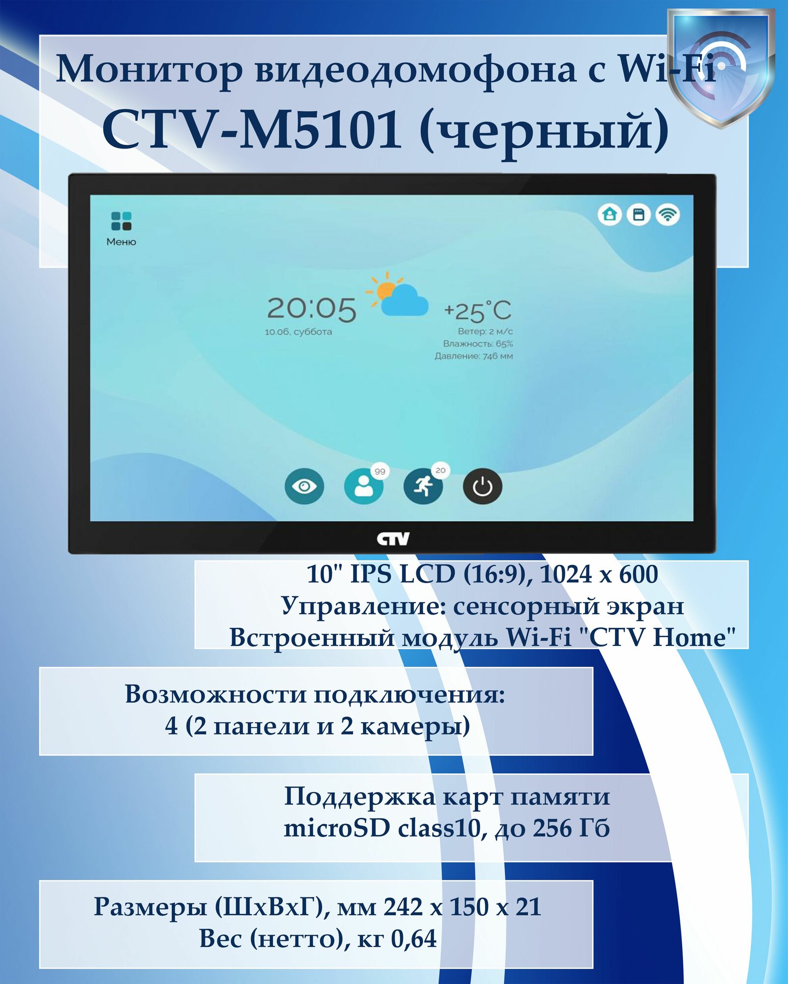 CTV-M5101 (черный) монитор видеодомофона с 10″ сенсорным дисплеем поддержкой Wi-Fi и записью в Full HD: сравнение цен, характеристики, фото, актуальное наличие и цены.