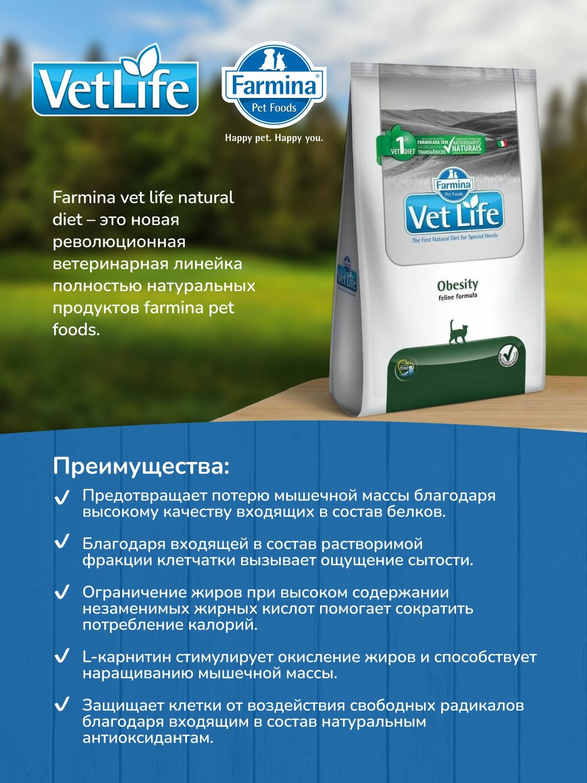 Farmina Vet Life Obesity - полнорационный диетический корм для взрослых кошек для снижения избыточной массы тела.