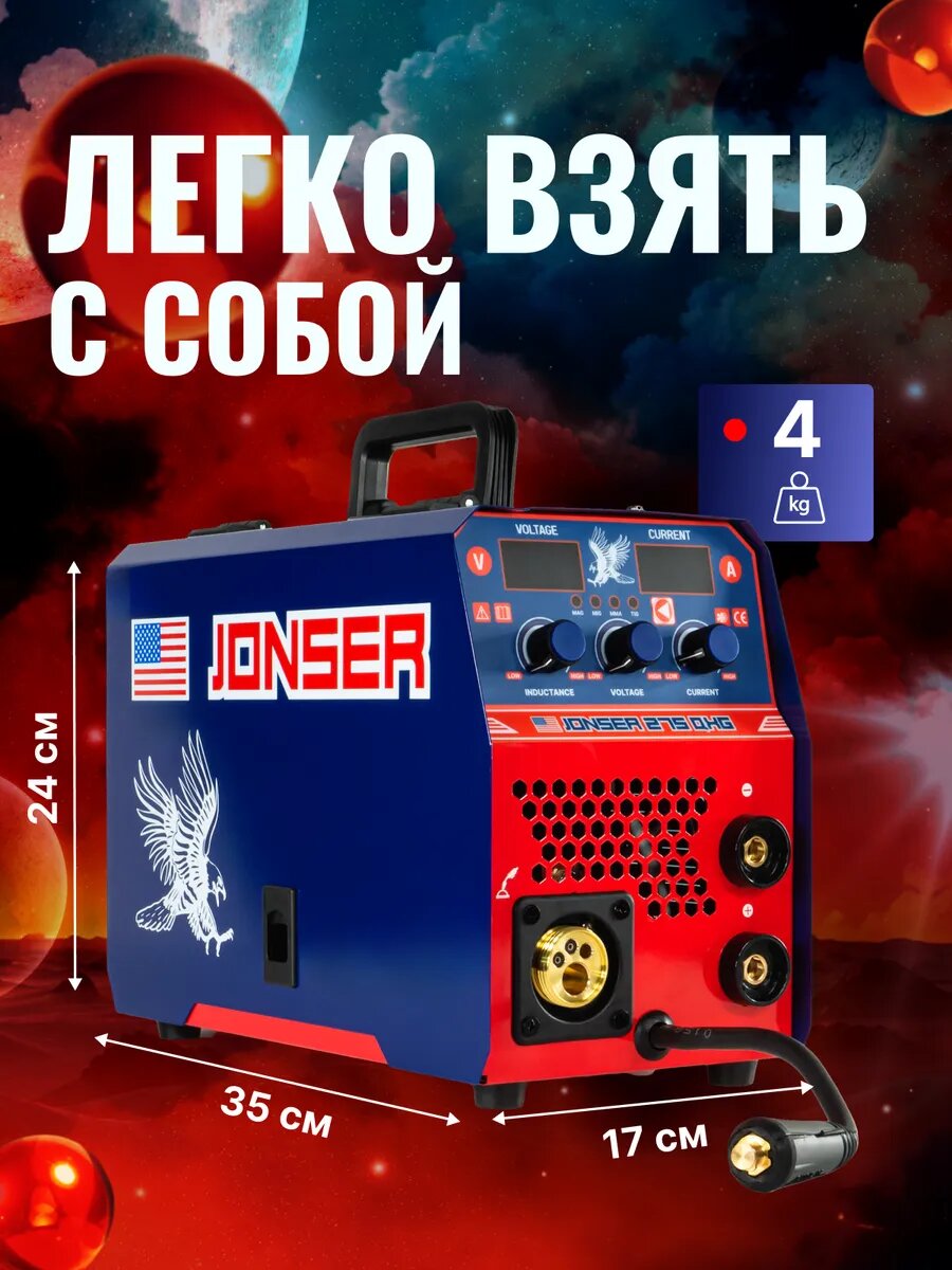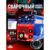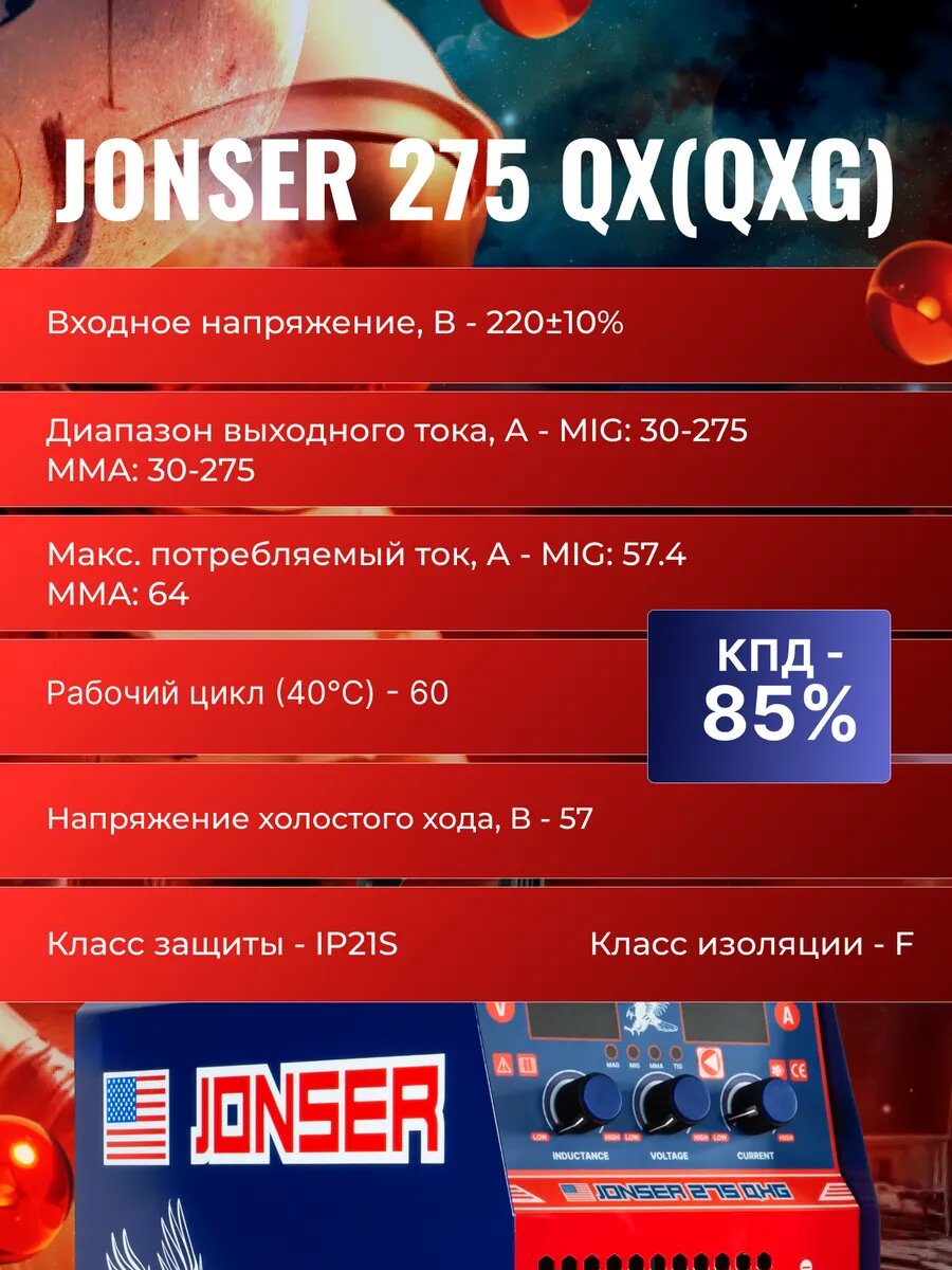 JONSER 275QX(QXG) Одна из самых популярных моделей в наше современное время! Позволяет выполнять сварочные работы различной сложности. Идеальный выбор для домашнего использования (в быту), работы на даче, в мастерской и гараже. Справится новичок, будет доволен опытный сварщик! Макс. сварочный ток 270А. Режимы работы- в полуавтоматическом режиме MIG порошковой 0,8-1,0 мм проволокой без газа - в режиме MMA штучными электродами 1.6-4.0 мм - аргонодуговая сварка LIFT TIG с помощью вентильной горелки (Внимание! Рукав в комплект не входит) Максимальная загрузка проволоки до 5 кг, D200. Надежный механизм подачи проволоки: металлические ролики, корпус из ударопрочного пластика. Современный, легкий в настройке, удобный в работе аппарат подойдет в качестве оригинального подарка для мужа, отца, сына, дедушки, брата, друга на любой праздник! Комплектация Сварочный аппарат - 1 шт. Руководство по эксплуатации – 1 шт. Газовый шланг - 3 м Кабель с горелкой - 1.9 м Кабель с клеммой заземления - 1.3 м Кабель с держателем электродов - 1.9 м Запасные наконечники (0.8 мм и 1.0 мм) Ролик под газ Хомоты для шланга Сварочная проволока