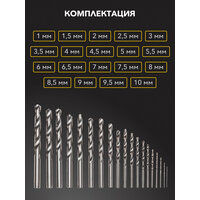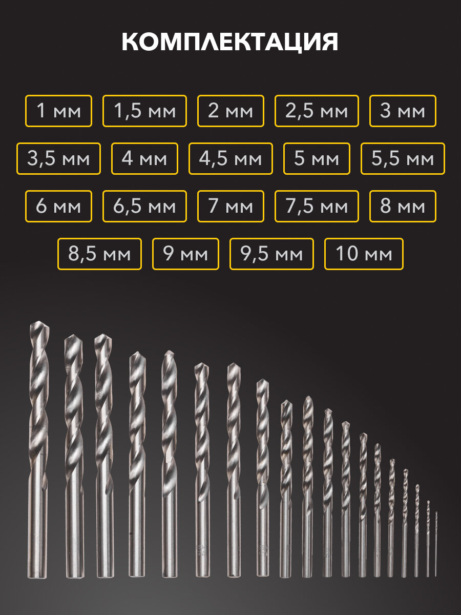 Материал: быстрорежущая сталь HSS. Угол заточки: 118°. Тип хвостовика: цилиндрический. Количество сверл: 19 шт. Диаметры сверл: от 1 мм до 10 мм. Применение: