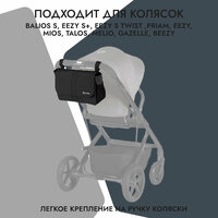 Сумка легко крепится на ручку коляски с помощью лент с липучками, что позволяет использовать ее с любой моделью с единой ручкой. Передний клапан сумки фиксируется на магнитах, обеспечивая быстрый доступ к содержимому.