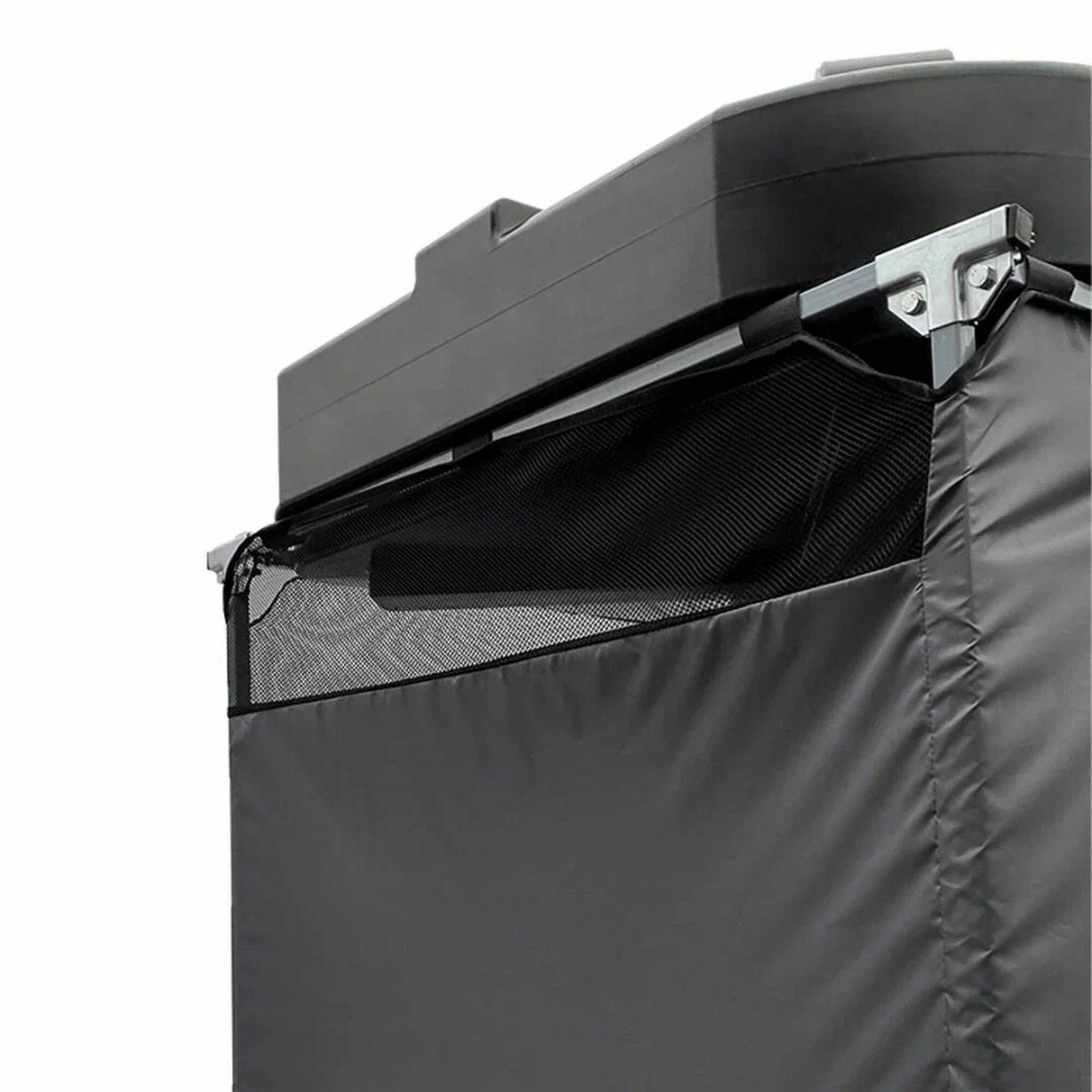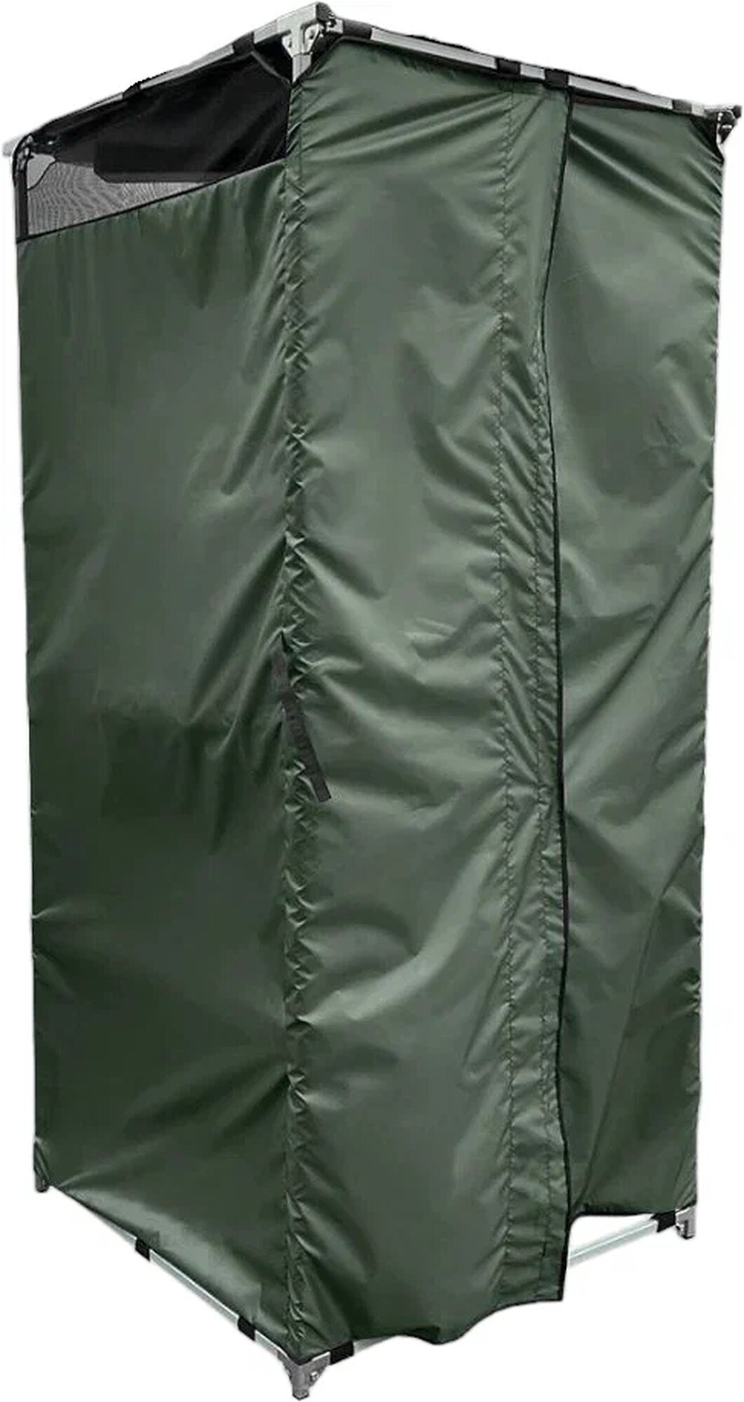 Тент душевой кабины изготовлен из влагостойкого материала. Верхняя часть - сетка, пропускающая свет и свежий воздух. Дверцы закрываются на магнитный замок, делая использование еще комфортнее. Внутри, на удобной высоте, есть карман – сумка для банных принадлежностей, а на полу – мягкий резиновый коврик.