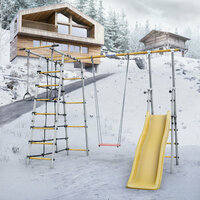 Материал изготовления комплекса - металл, что гарантирует его долговечность и надежность. Высота комплекса составляет 2,05 м, а занимаемая площадь - 2,68 х 2,45 м.