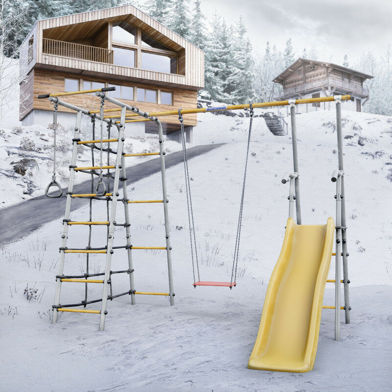 Комплектация комплекса включает в себя горку, гимнастические кольца, веревочный лаз, гимнастическую лестницу, турник неподвижный и качели фанерные. Допустимая нагрузка на турник составляет 100 кг, а на навесное оборудование - 50 кг.