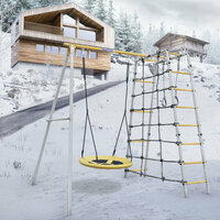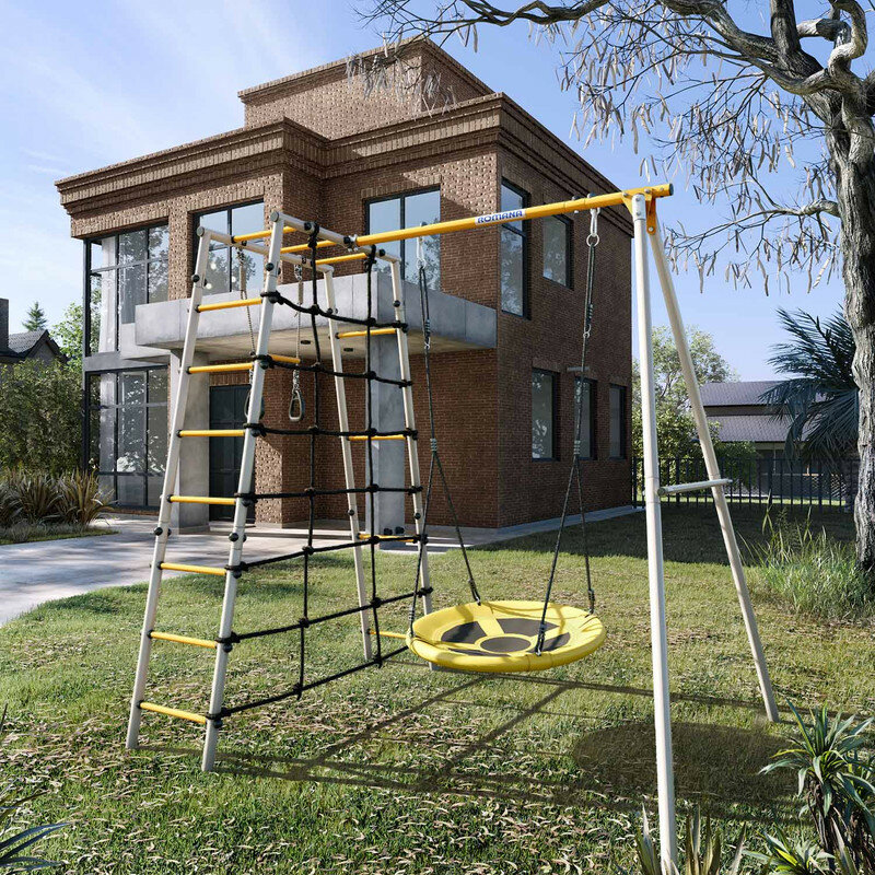 Комплектация комплекса включает в себя кольца с перекладиной, веревочный лаз, гимнастическую лестницу, рукоход и качели гнездо. Это позволяет детям заниматься различными видами активности, такими как лазанье, гимнастика и игры на качелях.