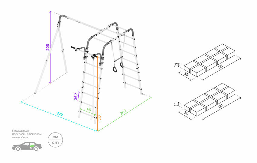 Высота комплекса составляет 2,09 м, а занимаемая площадь - 2,27 х 2,02 м. Диаметр трубы составляет 42 мм, а толщина металла стоек и качельной балки - 1,5 и 3 мм соответственно. Диаметр ступени - 25 мм, а шаг ступени лестницы - 0,263 м. Ширина ступеней лестницы составляет 0,49 м.