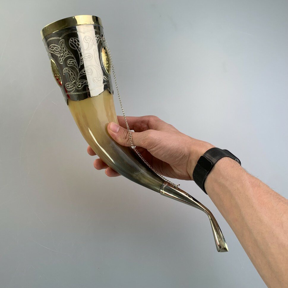 Упаковка: Без упаковки. Высота: 30-35 см (изготавливается из настоящего рога, поэтому размеры и форма могут быть разными). Материал: Рог крупного рогатого скота, Металл. Объём: около 400 мл. Бренд: Дагестан. Страна производства: Россия. Цена указана за 1 рог. Важно: Рог интерьерный, не предназначен для использования в качестве сосуда для напитков.