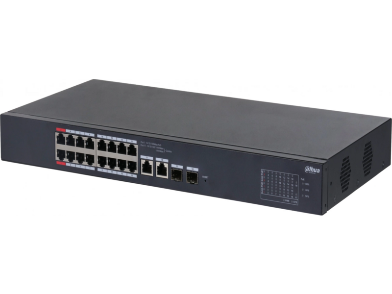 Купить DAHUA DH-CS4218-16ET-240 16-портовый PoE коммутатор L2 с функцией облачного управления, 16xRJ45 100Mb PoE, 2хкомбо SFP/RJ45 1Gb uplink, суммарно 240вт, коммутация 7.2 гбит/с, MAC-таблица 8к с доставкой по всей России.