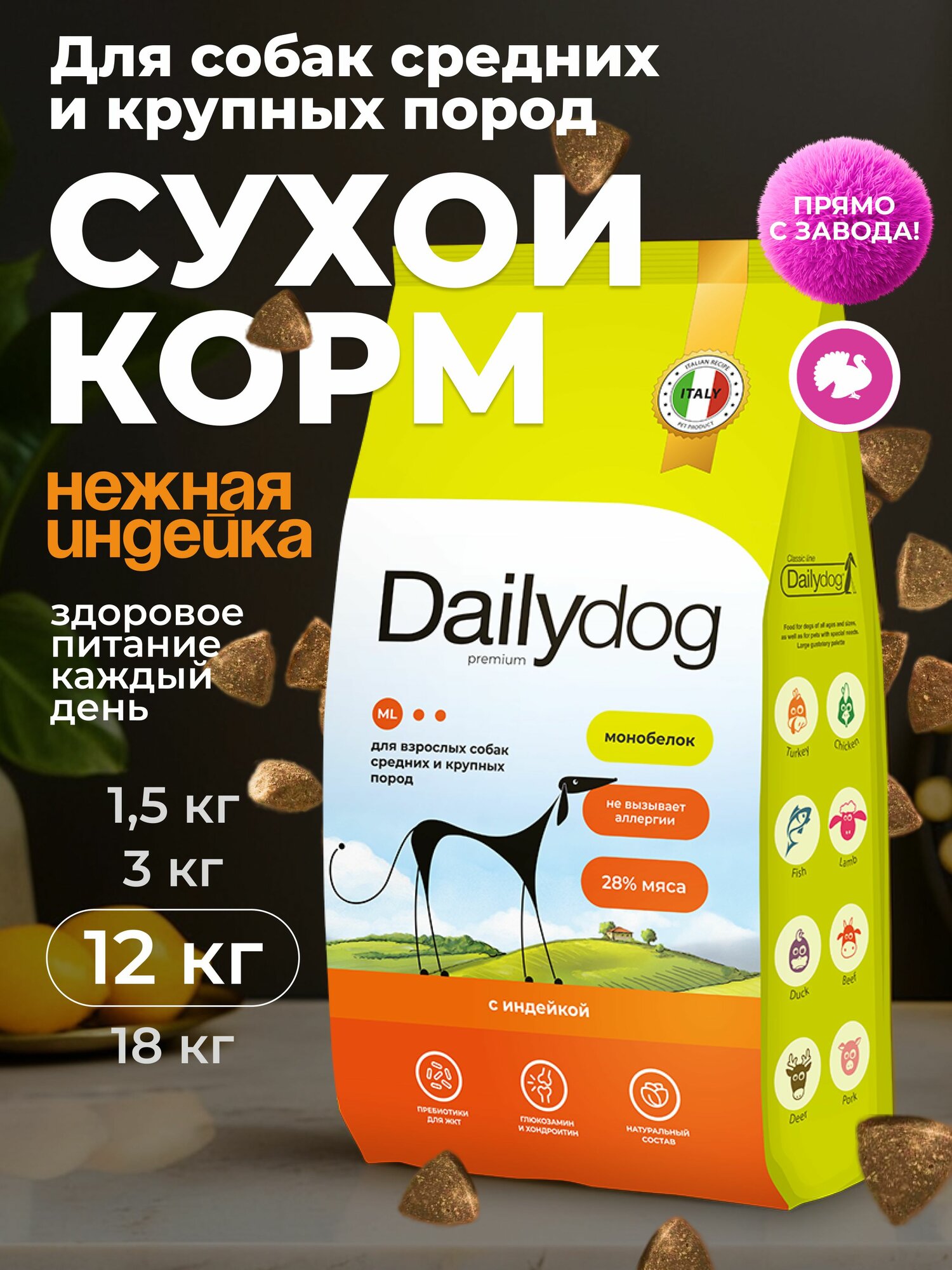 Корм сухой Dailydog для собак средних и крупных пород, с индейкой, 12 кг: сравнение цен, характеристики, фото, актуальное наличие и цены.