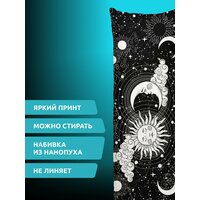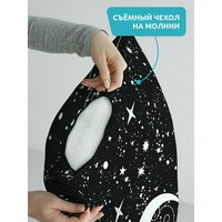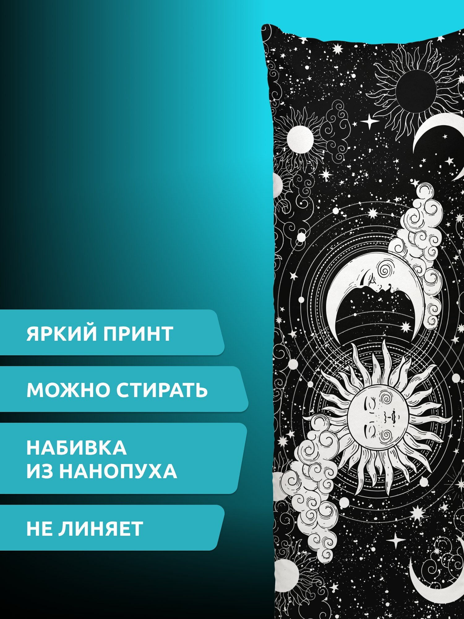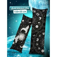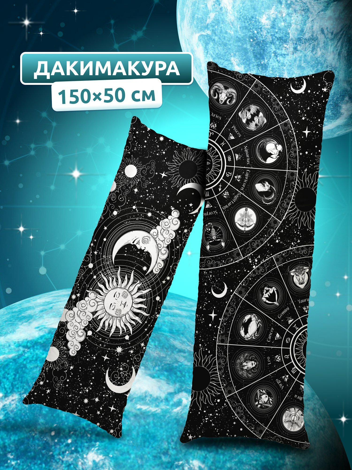 Не важно, кто вы по знаку зодиака: овен, телец, близнецы, рак, лев, дева, весы, скопион, змееносец, стрелец, козерог, водолей или рыбы. Принты на этой дакимакуре для обнимания — это не просто украшение, а рассказ, написанный языком космоса и астрологии. С одной стороны — стильный чёрно-белый зодиак с солнцем посередине, разбитый на два полукруга, который словно шепчет о тайнах Вселенной. С другой стороны дакимакура 150 на 50 — стилизованное изображение звездного неба, солнца и луны, погружающее вас в глубины мудрости и вечной трансформации. Это два разных мира, две истории, которые вы можете выбирать каждый вечер перед сном.