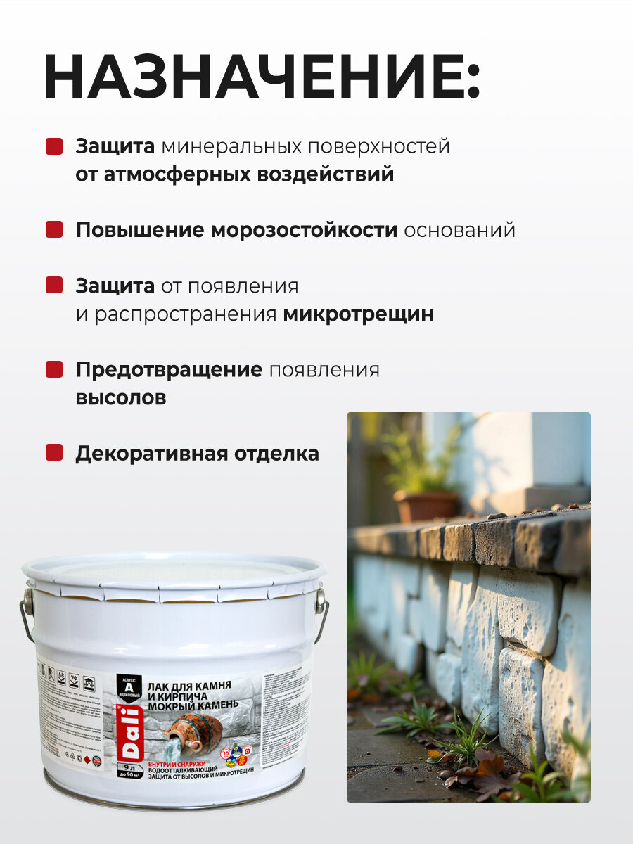 Dali / Дали лак для камня Мокрый камень органорастворимый акриловый полуглянцевый. Подходит для внешней облицовки печей и каминов. Назначение: защита минеральных поверхностей от атмосферных воздействий; повышение морозостойкости оснований; защита от появления и распространения микротрещин; предотвращение появления высолов; декоративная отделка. Область применения: Применяется внутри и снаружи помещений по любым минеральным основаниям (природный и искусственный камень, кирпич, бетон, цемент, штукатурка, черепица, гипсовый декоративный камень и пр.), кроме полов и крыш. Подходит для внешней облицовки печей и каминов. Свойства: образует бесцветное полуглянцевое самоочищающееся покрытие: вода, попадающая на поверхность, смывает верхний микротонкий слой покрытия, тем самым очищая и обновляя его; содержит антисептик, предотвращая образование и развитие плесени и грибка; выдерживает нагревание до +50°С без пожелтения и размягчения; устойчив к воздействию УФ-излучения; прогнозируемый срок службы: снаружи помещений - до 3 лет, внутри помещений - не менее 10 лет; легко ремонтируется отдельными участками. Подготовка поверхности и нанесение продукта: Перед применением перемешать. Наносить на сухую, чистую, не окрашенную или очищенную от всех старых покрытий поверхность при t° окружающего воздуха и поверхности не ниже +5°С кистью, валиком или распылителем в несколько слоев. Каждый последующий слой наносить после полного высыхания предыдущего. Условия транспортировки и хранения: Хранить при t° от -40° до +40°С, не теряет свойств при замораживании.
