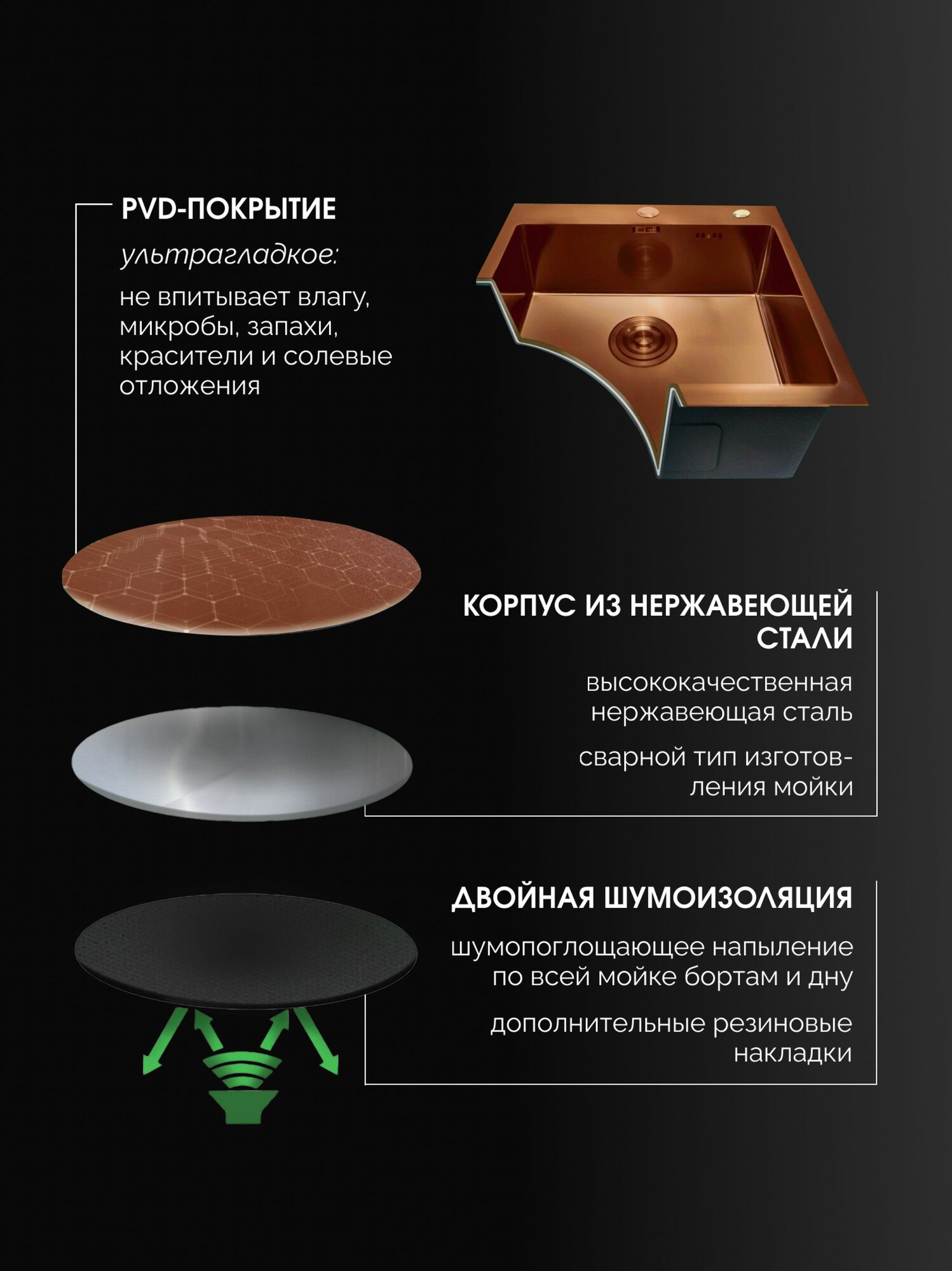 Кухонная мойка DARILINE универсального монтажа изготовлена из высококачественной нержавеющей стали толщиной от 1 до 3 мм. Химический состав и свойства материала делают раковину наиболее подходящей для применения в пищевой промышленности. Мойка из нержавеющей стали для кухни показывает высокие характеристики коррозийной стойкости в агрессивных средах. В данной модели раковины для кухни двойная шумоизоляция со всех сторон, что позволяет максимально снизить звук от потока воды. Мойка из нержавейки для кухни имеет антибактериальное PVD покрытие. Поверхность мойки на кухне с таким покрытием наиболее проста в уходе, устойчива к механическим повреждениям, высоким температурам. С нее легко удалить следы жира, грязи и разводы от воды. Глубина мойки для кухни 210 мм делает ее вместительной и удобной в эксплуатации. Широкий диаметр слива, препятствует возникновению засоров. Раковина проста в установке и имеет универсальный тип монтажа: накладная, врезная или под столешницу. Мойка укомплектована сифоном с защитой от перелива, врезным дозатором для жидкого мыла или средства для мытья посуды и коландером. Коландер размещается в чаше и позволяет размораживать продукты или сушить посуду после мытья, позволяя более рационально использовать пространство. Врезной дозатор также поможет освободить место на кухне.