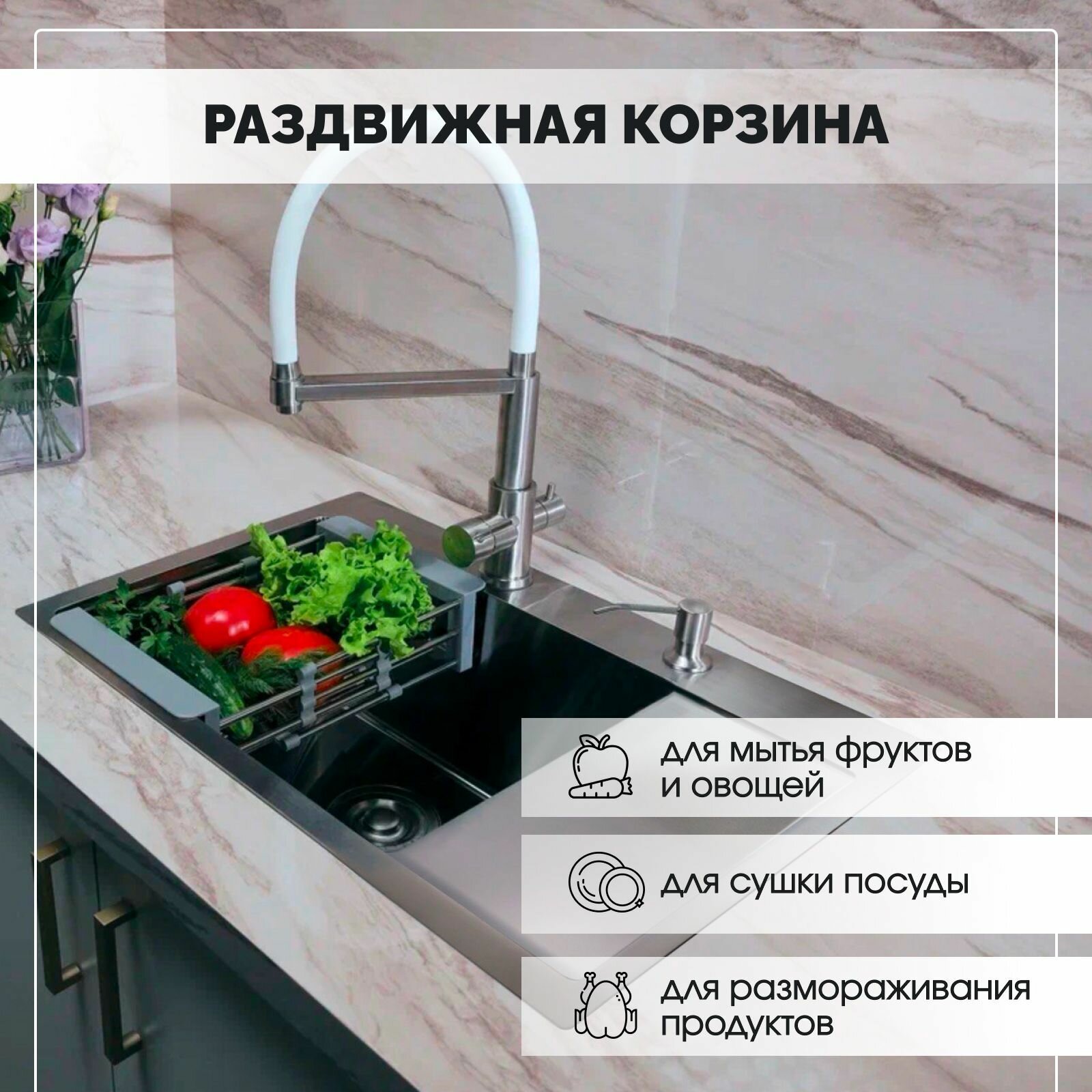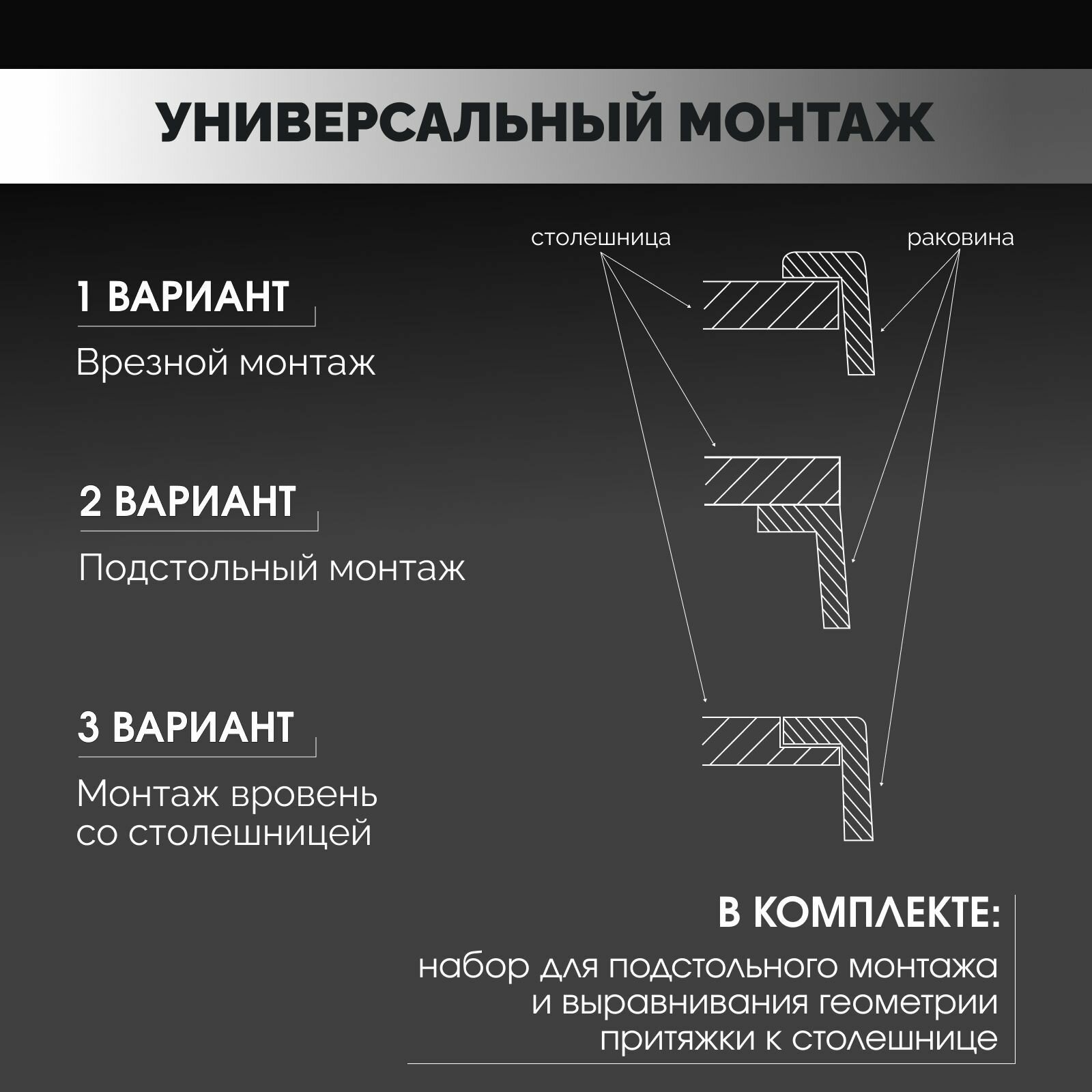 Кухонная мойка DARILINE универсального монтажа изготовлена из высококачественной нержавеющей стали толщиной от 1 до 3 мм. Химический состав и свойства материала делают раковину наиболее подходящей для применения в пищевой промышленности. Мойка из нержавеющей стали для кухни показывает высокие характеристики коррозийной стойкости в агрессивных средах. В данной модели раковины для кухни двойная шумоизоляция со всех сторон, что позволяет максимально снизить звук от потока воды. Мойка из нержавейки для кухни имеет антибактериальное PVD покрытие. Поверхность мойки на кухне с таким покрытием наиболее проста в уходе, устойчива к механическим повреждениям, высоким температурам. С нее легко удалить следы жира, грязи и разводы от воды. Глубина мойки для кухни 210 мм делает ее вместительной и удобной в эксплуатации. Широкий диаметр слива, препятствует возникновению засоров. Раковина проста в установке и имеет универсальный тип монтажа: накладная, врезная или под столешницу. Мойка укомплектована сифоном с защитой от перелива, врезным дозатором для жидкого мыла или средства для мытья посуды и коландером. Коландер размещается в чаше и позволяет размораживать продукты или сушить посуду после мытья, позволяя более рационально использовать пространство. Врезной дозатор также поможет освободить место на кухне. Раковина для кухни.