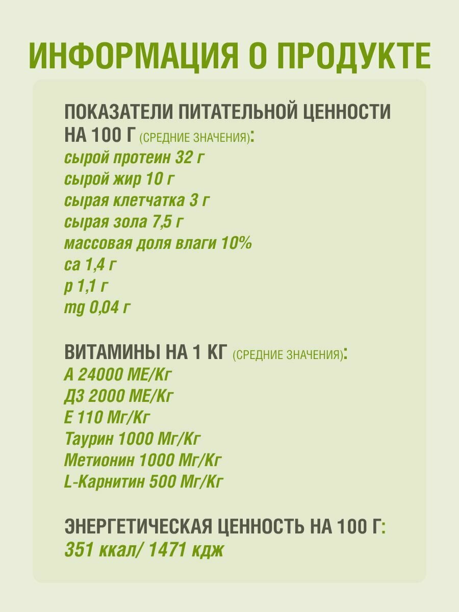 Пищевая ценность: сырой протеин 32%, сырой жир 10%, сырая клетчатка 3%, сырая зола 7,5%, Са 1,4%, Р 1,1%, Mg 0,04%
