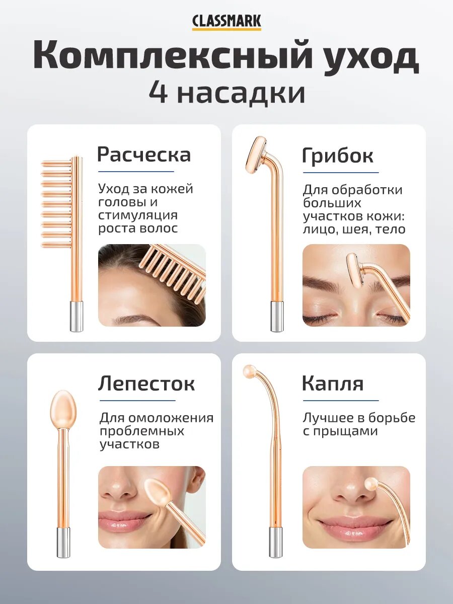 Медицинский дарсонваль - настоящая находка для тех, кто хочет подарить своим волосам, лицу и телу максимум внимания и заботы. Он наполнен магической энергией, стимулирующая рост волос при недостатке питания и нарушенном кровообращении как у мужчин, так и у женщин, снимает усталость и улучшает состояние кожи. Косметический аппарат для физиотерапии с микротоками - настоящий чудотворец, способный вернуть красоту. Вы насладитесь прекрасным массажем, который поможет расслабиться и снять стресс. Электрический ток бережно проникает в кожу, принося с собой оздоровление, укрепление и омоложение, оказывая антицеллюлитный эффект. Обладают бактерицидными свойствами и помогают в лечении акне, угрей и чёрных точках, против морщин и их профилактики. Данные аксессуары - просто необходимая вещь для женщины, которая ценит красоту. Волосы становятся сильными и сияющими, лицо обретает свежий вид, а тело - нежность. Наш профессиональный прибор - настоящий эксперт в борьбе с несовершенствами и проблемами. Он имеет насадку, которая поможет бороться с выпадением волос и укреплять их от корней до кончиков: устранение перхоти, снижение жирности и восстановление структуры. Частью косметологических процедур дарсонвализации и электро массажера является специальная насадка, которая справится с прыщами и приведет жирную кожу в порядок. В микротоковый импульсный массажер для лица входит еще насадка расческа, которая преображает волосы и придает им здоровья. Она поможет создать поразительные прически, восстановить поврежденные волосы головы и добавить объем и эластичность. Физиотерапевтический аппарат дарсенваль обладает уникальными свойствами, которые помогут облегчить напряжение и боли в суставах, ягодицах и других частях тела, например, шеи и спины. Его лечебный эффект делает его незаменимым помощником антистрессом, снимает напряжение и спасает от отеков. Борется с целлюлитом и растяжками, насыщая клетки кислородом. Близкие будут в приятном шоке, получив такой подарок