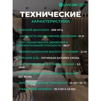 | Дополнительная информация | Рабочий диапазон 868 МГц, Рекомендованная высота установки 2,1 м, Диапазон рабочих температур –20 до +55 °С, Питание (3 В) литиевая батарея CR123A |