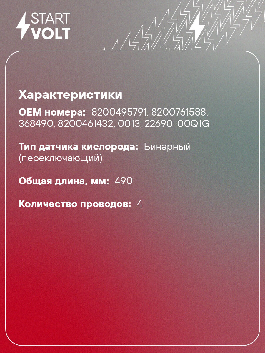 Датчик кислорода для автомобилей Renault Logan (09-)/Sandero (09-)/Duster (10-) 1.6i голубой провод VS-OS 0908 StartVolt: сравнение цен, характеристики, фото, актуальное наличие и цены.