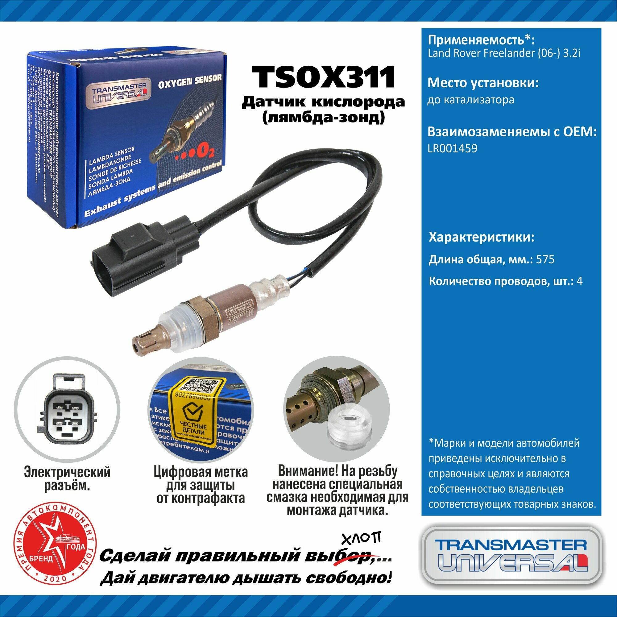 Купить Датчик кислорода глушителя (лямбда-зонд) Transmaster Universal TSOX311 до катализатора Land Rover Freelander (06-) 3.2i с доставкой по всей России.