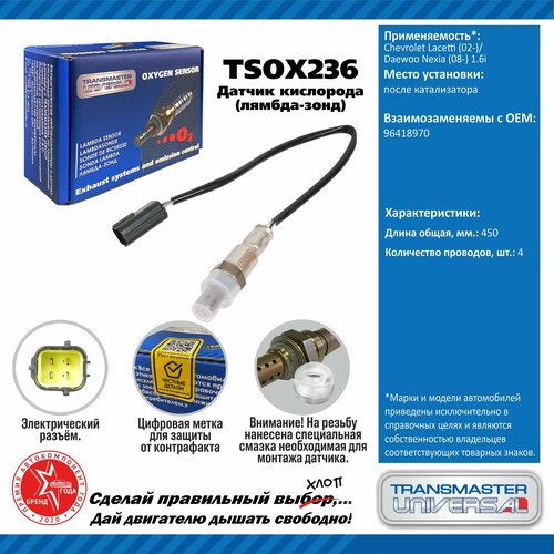 Купить Датчик кислорода (лямбда-зонд) для а/м Chevrolet Lacetti (02-)/Daewoo Nexia (08-) 1.6i, Transmaster universal TSOX236 с доставкой по всей России. Датчик кислорода (лямбда-зонд) для а/м Chevrolet Lacetti (02-)/Daewoo Nexia (08-) 1.6i, Transmaster universal TSOX236: сравнение цен, характеристики, фото, актуальное наличие и цены.