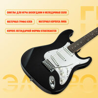 В комплекте: электрогитара; чехол; комбоусилитель; кабель для коммутации; тюнер для настройки; ремень; медиатор; запасная 1ая струна; ключи для настройки; рычаг для тремоло. Характеристики электрогитары: Звукосниматели: SSS; Количество ладов, шт: 22; Количество струн: 6; Крепление грифа: на болтах; Материал грифа: клен; Материал корпуса: липа; Материал накладки грифа: техновуд; Материал струн: металл; Материал топа: липа; Мензура, мм: 648 мм; Регулировки звука: 1V 2T; Страна происхождения: китай; Тип бриджа: тремоло; Тип корпуса: Стратокастер;