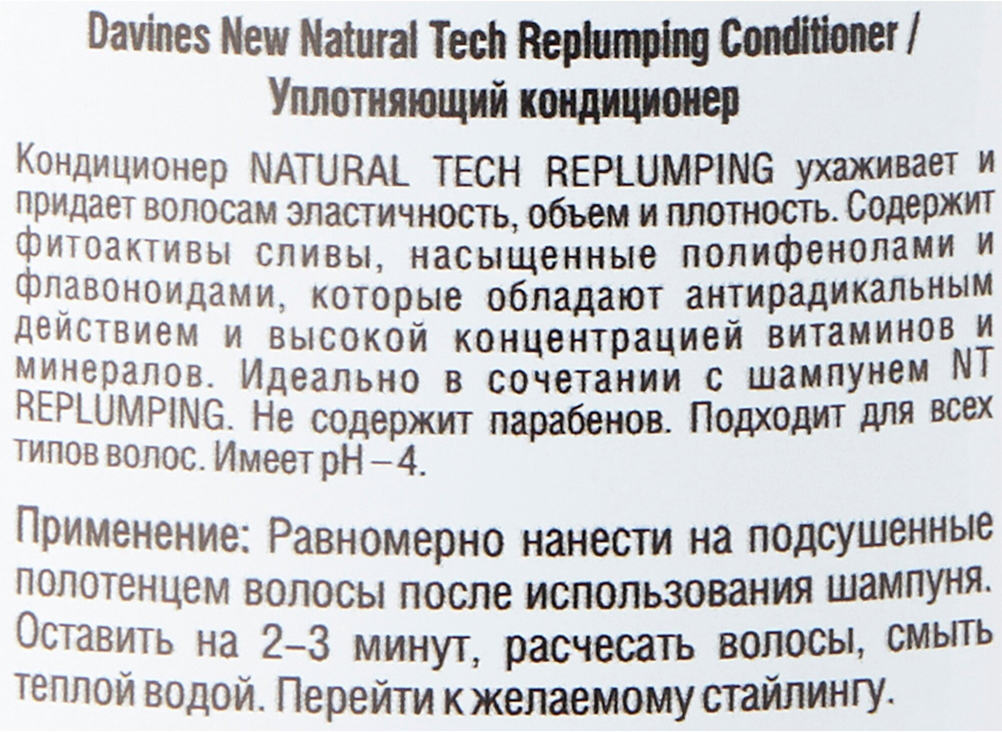 | Способ применения | Нанесите примерно одну столовую ложку кондиционера на влажные волосы, отступив от корней. Используйте кондиционер после очищения волос с помощью шампуня Replumping Shampoo. Оставьте на 2-3 минуты. Расчешите и смойте водой. |