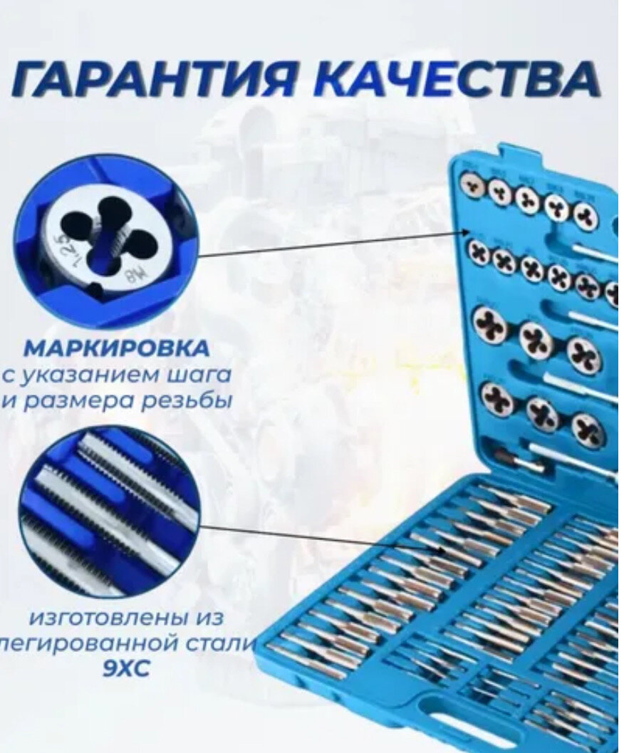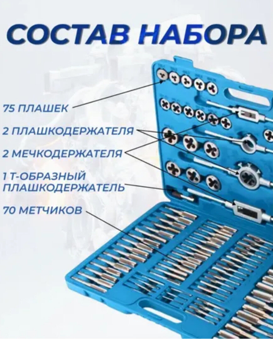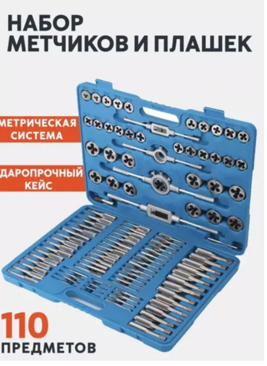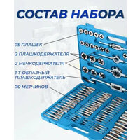 | Подробная комплектация | В набор входят: Метчики комплектные (по 2 шт): М2x0,4; М3x0,5; М4x0,7; М5x0,8; М6x0,75; М6x1; М7x0.75; М7x1; М8x0,75; М8x1; М8x1,25; М9x0,75; М9x1; М9x1,25; М10x0,75; М10x1; М10x1,25; М10x1,5; М11x0,75; М11x1; М11x1,25; М11x1,5; М12x0,75; М12x1; М12x1,25; М12x1,5; М12x1,75; М14x1; М14x1,25; М14x1,5; М14x2; М16x1; М16x1,5; М16x2; М18x1,5. Плашки: М2x0,4; М3x0,5; М4x0,7; М5x0,8; М6x0,75; М6x1; М7x0.75; М7x1; М8x0,75; М8x1; М8x1,25; М9x0,75; М9x1; М9x1,25; М10x0,75; М10x1; М10x1,25; М10x1,5; М11x0,75; М11x1; М11x1,25; М11x1,5; М12x0,75; М12x1; М12x1,25; М12x1,5; М12x1,75; М14x1; М14x1,25; М14x1,5; М14x2; М16x1; М16x1,5; М16x2; М18x1,5. Метчикодержатели: М3-М12; М6-М20; Т-образный цанговый М5-М8. Плашкодержатели под плашки с внешним диаметром: D 25 мм; D 38 мм. |