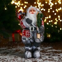 Фигурка Деда Мороза в клетчатом тулупе, с колокольчиком, борода и усы из текстиля, ботинки светятся, работает от 3 батареек типа LR44, размер 13х28 см.