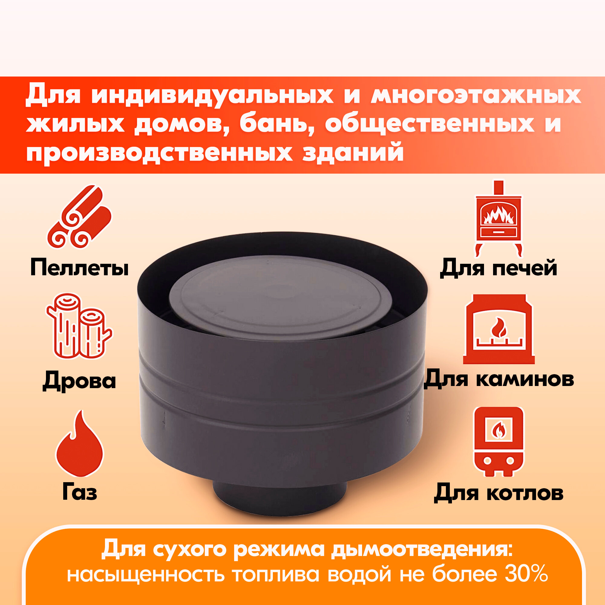 Дефлектор дымохода Моно подходит для установки на печное оборудование отапливаемое газом, дровами или пеллетами. Подходит для сухого режима дымоотведения, то есть насыщенность топлива водой должна быть не более 30%.