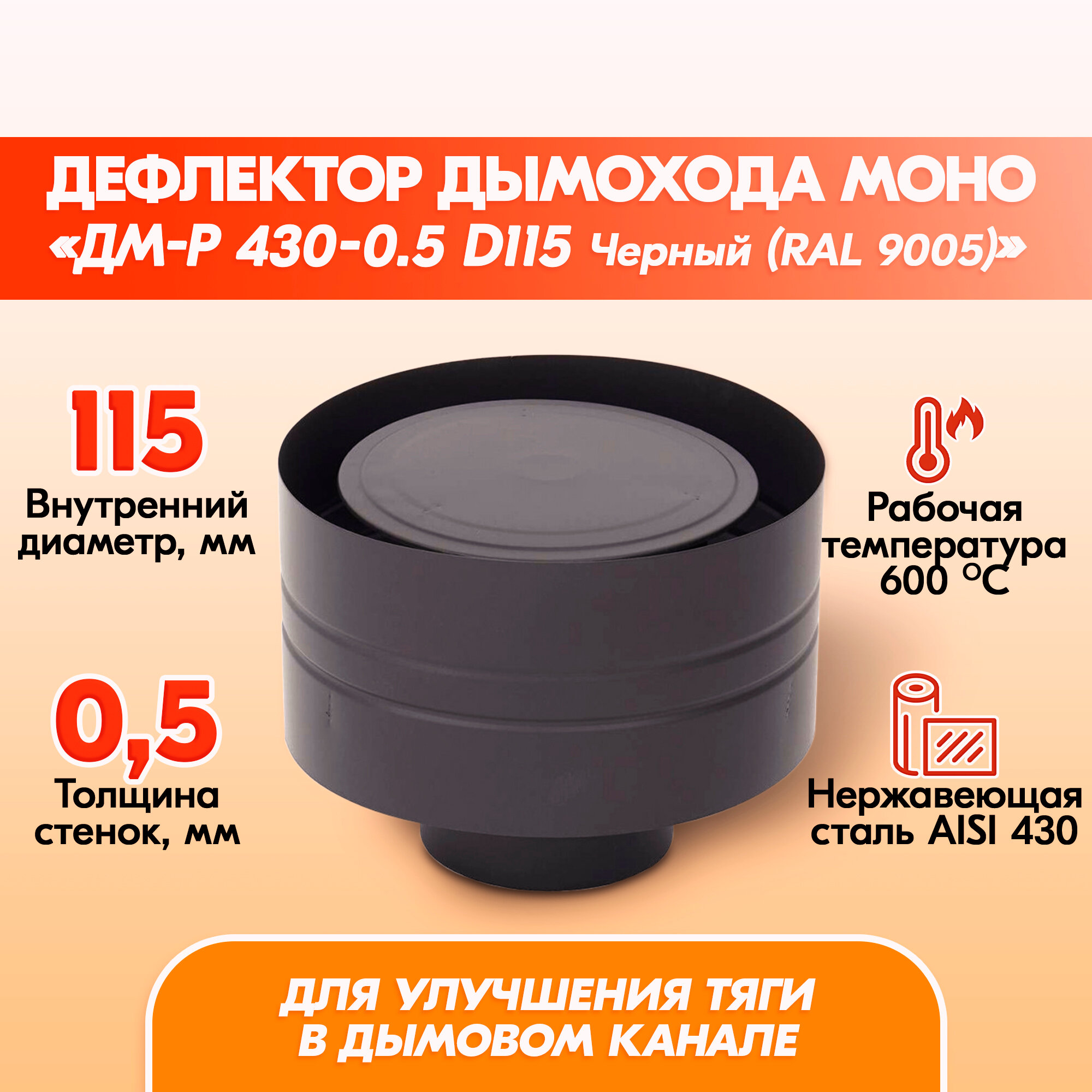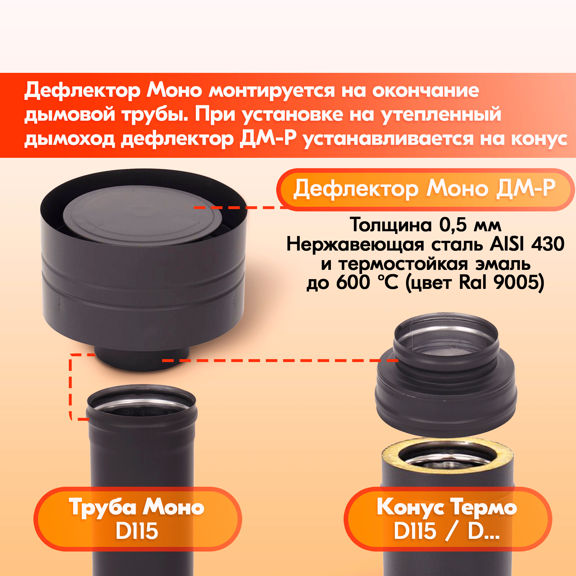 Подходит для установки на отопительные печи, банные печи, камины, котлы, казан-мангалы, устанавливаемые в индивидуальных и многоэтажных жилых домах, банях, общественных и производственных зданиях. Дефлектор из нержавейки для дымохода обеспечивает герметичное соединение конструкции дымохода. Конструкция и применяемые материалы дефлектора для моно и сэндвич дымохода обеспечивают безопасность, герметичность, газоплотность, высокую устойчивость к температурным (до 600 °С), кислотным и весовым нагрузкам, возникающим в процессе эксплуатации дымохода.