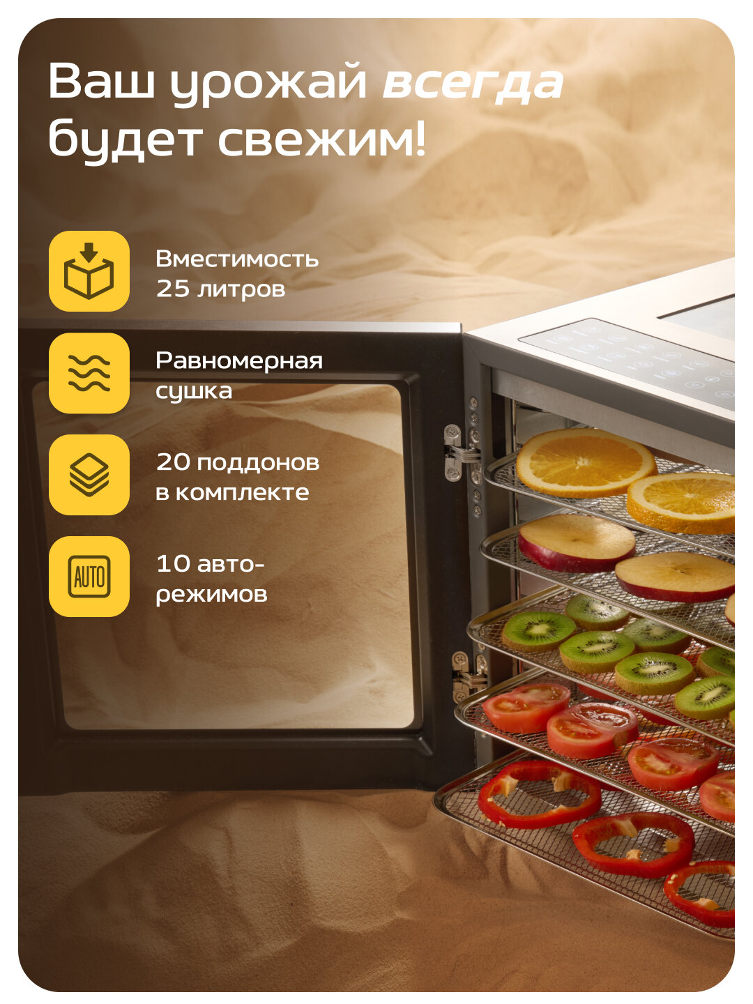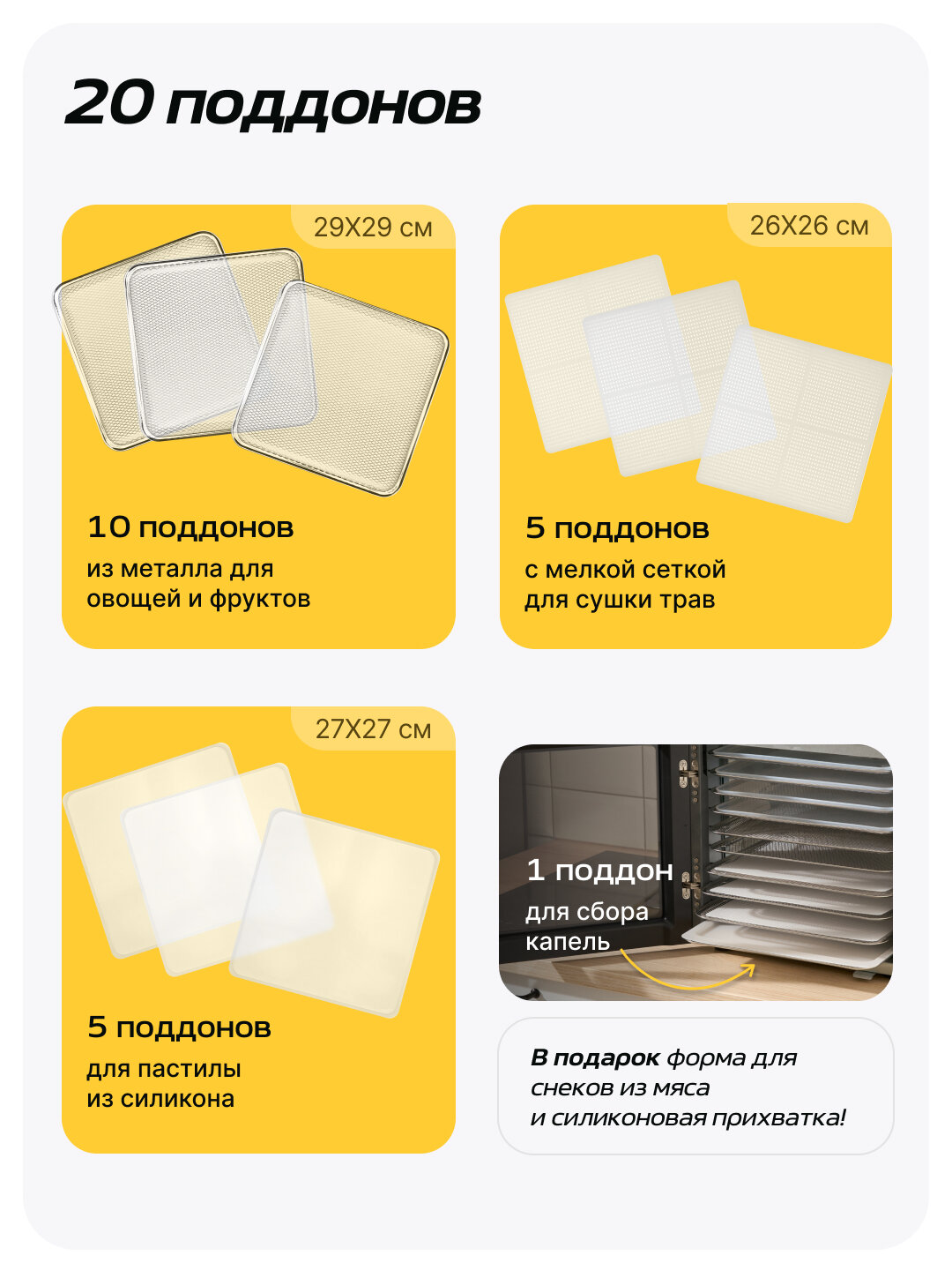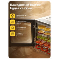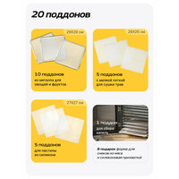 | Дополнительная информация | Таймер на 48 часов, 10 автопрограмм, 3 окна для контроля процесса, 10 металлических поддонов, 5 пластиковых поддонов с мелкой сеткой, 5 силиконовых поддонов для пастилы, поддон для капель, силиконовая прихватка, силиконовая форма для снеков |