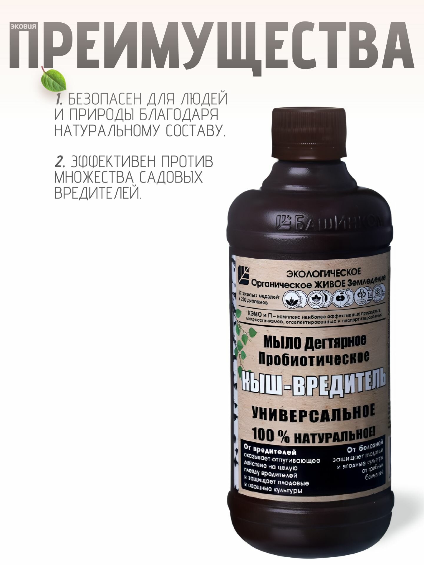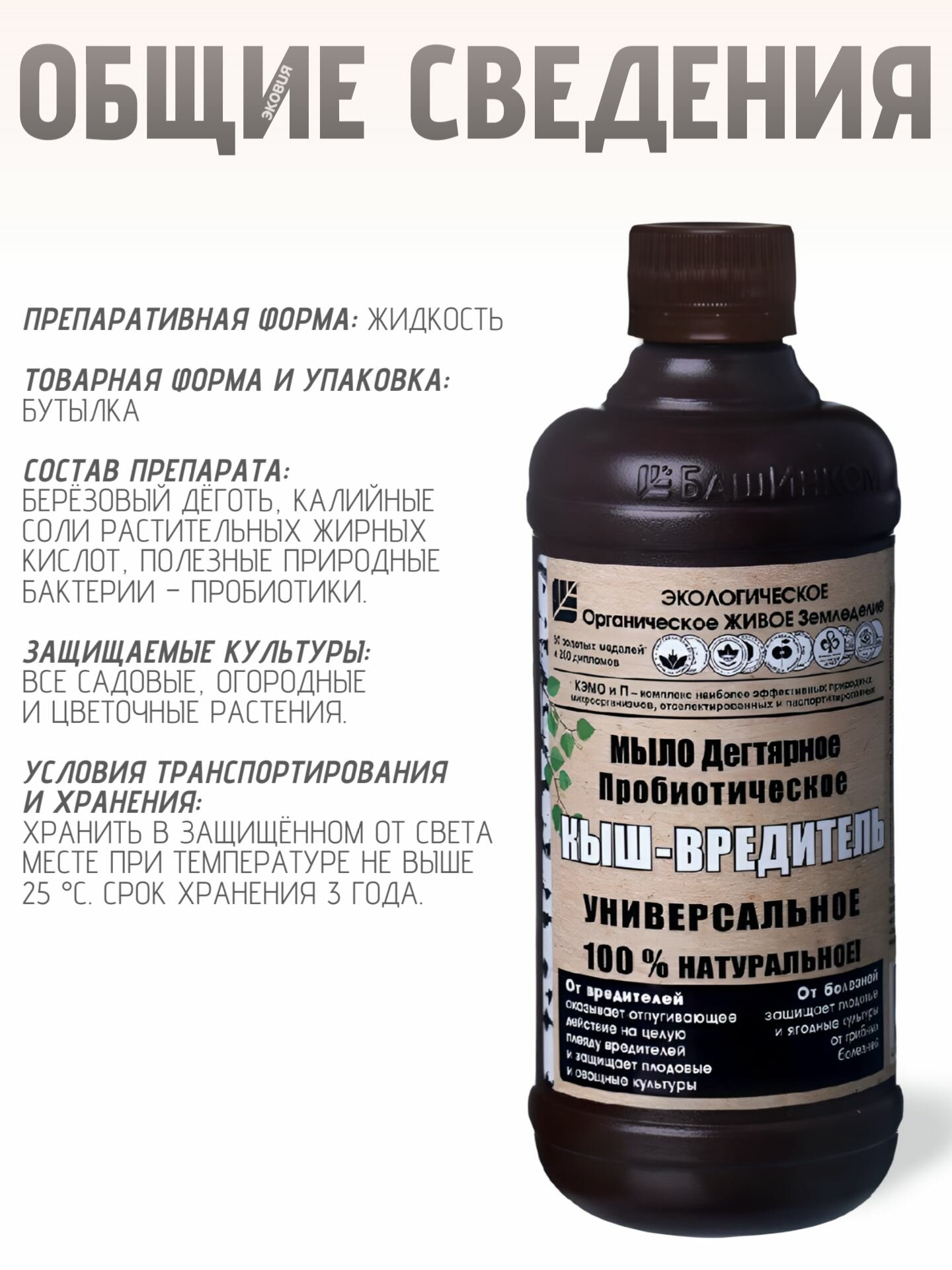 Этот продукт предназначен для биологической защиты и борьбы с вредителями на садовых участках. Он предотвращает появление и уничтожает широкий спектр вредителей, таких как тля, клещи, бабочки, жуки и грызуны. Основные компоненты мыла — калийные соли жирных кислот, березовый деготь и пробиотики.