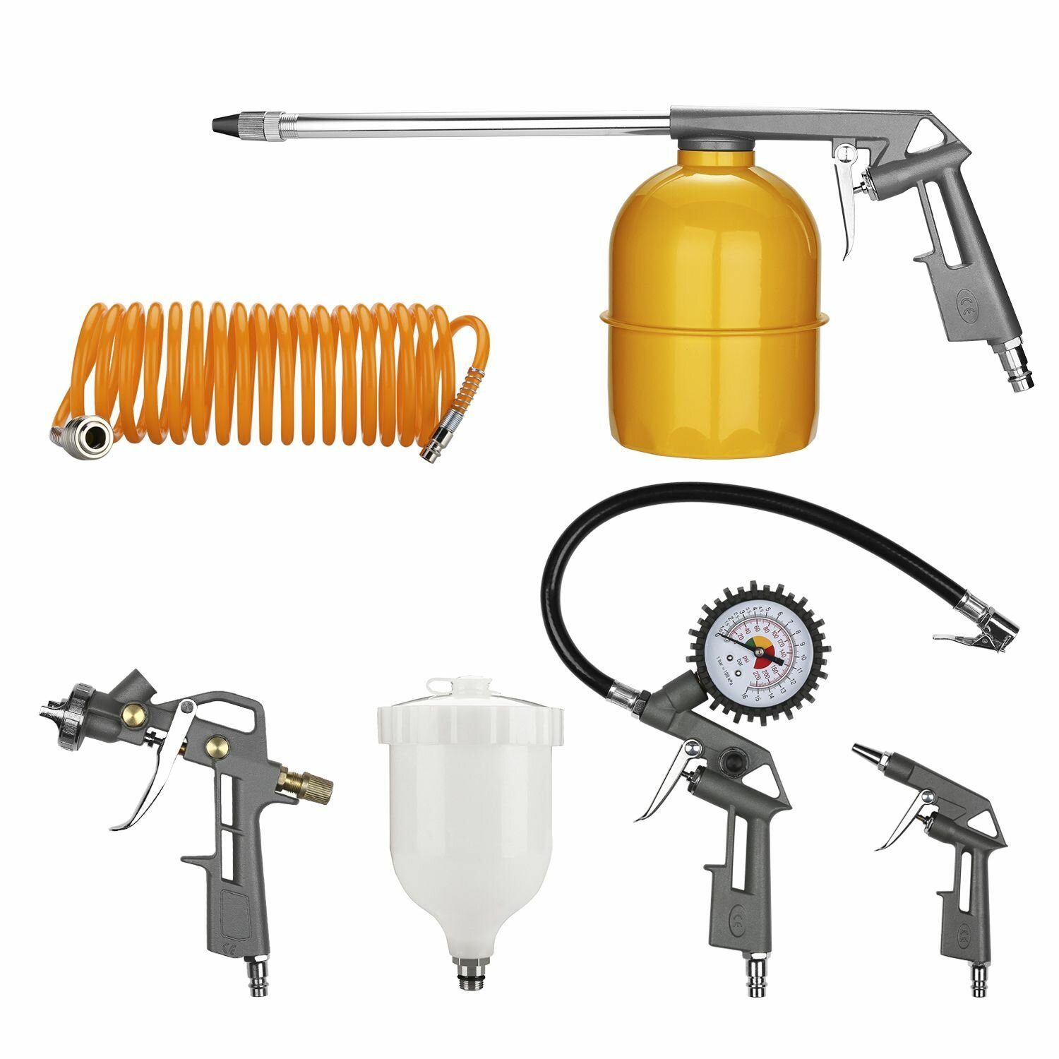 Комплектация: Краскораспылитель с верхним бачком Продувочный пистолет Моющий пистолет Пистолет для подкачки Шланг воздушный спиральный